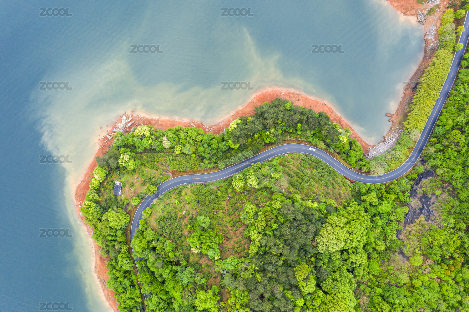 航拍中国浙江千岛湖湖畔公路及森林