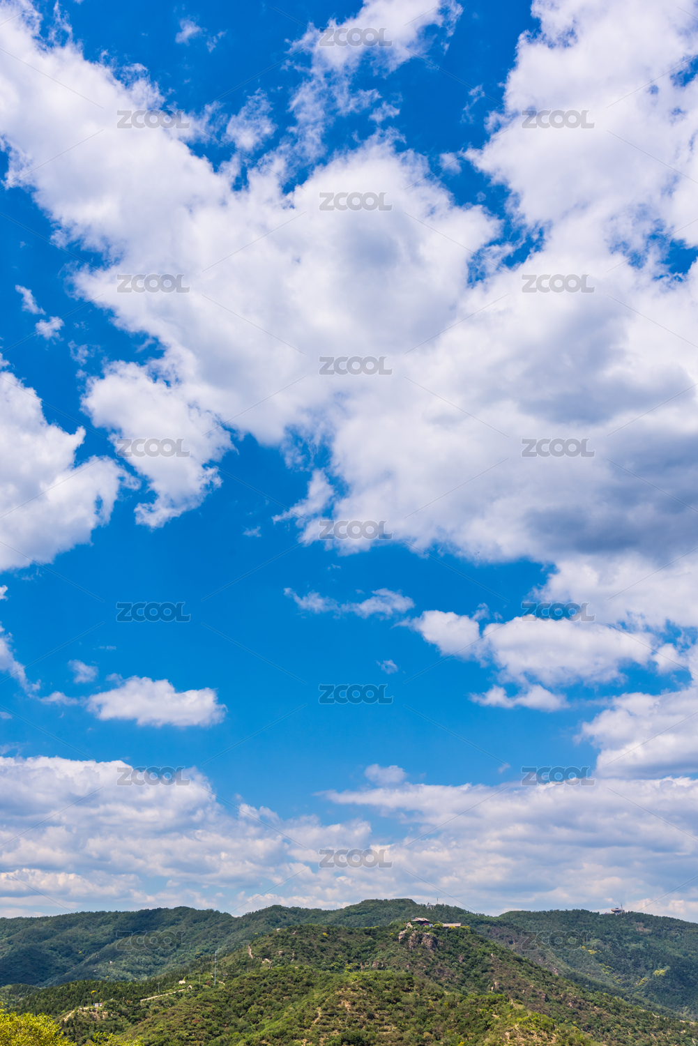 蓝天白云下的北京西山国家森林公园的山坡树