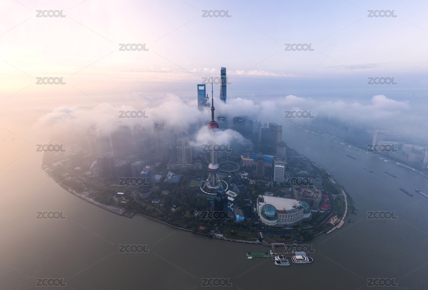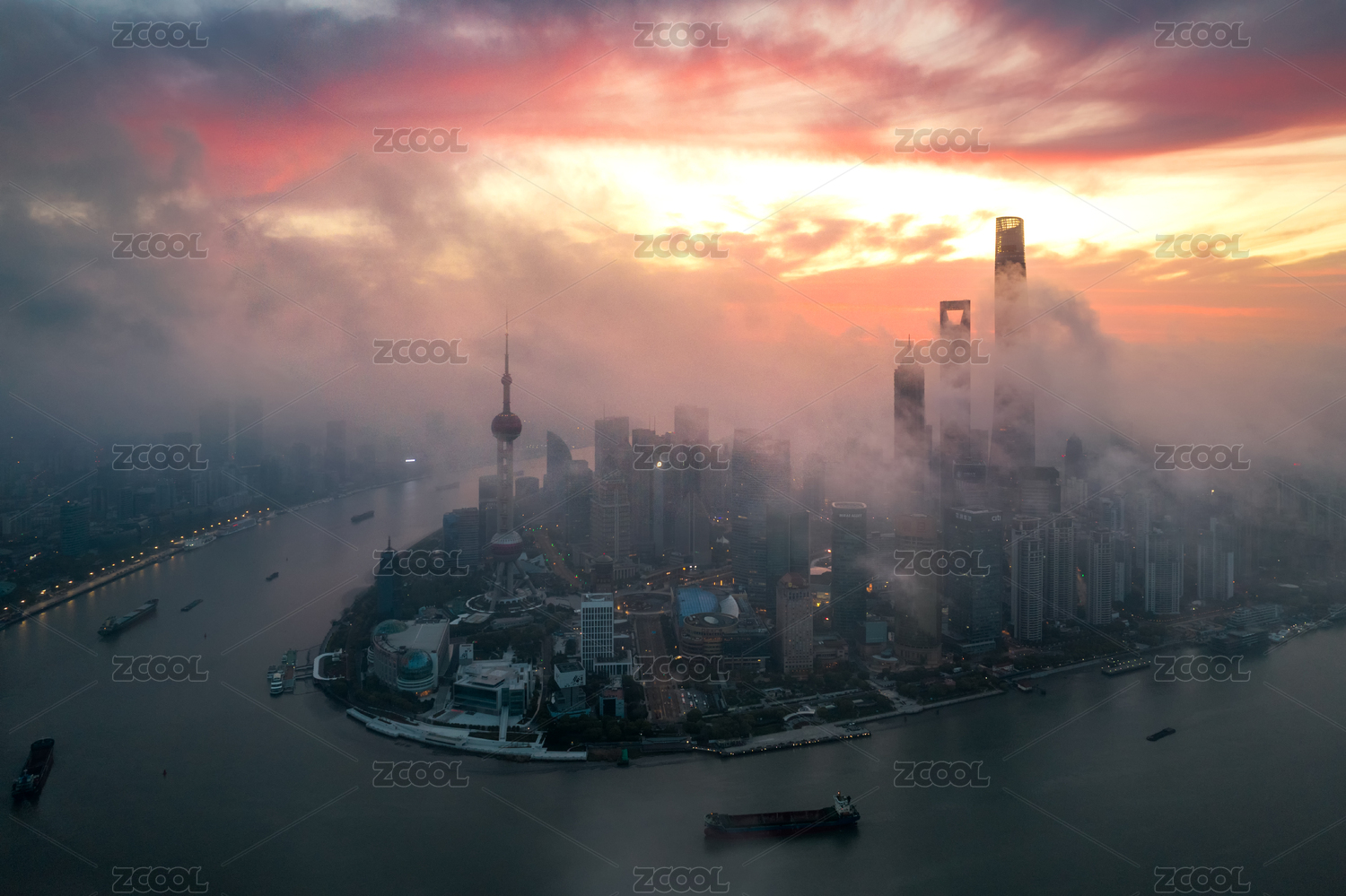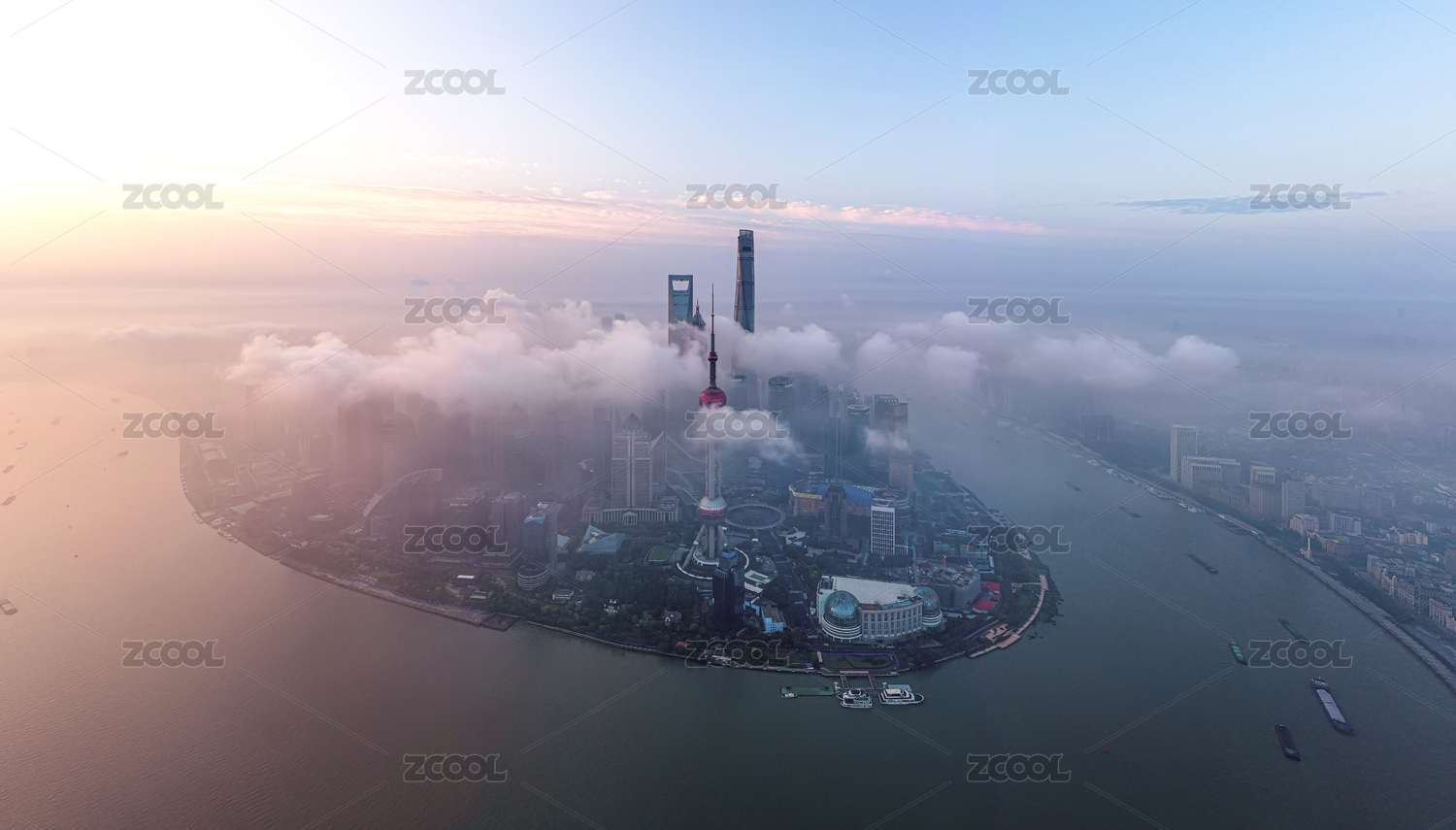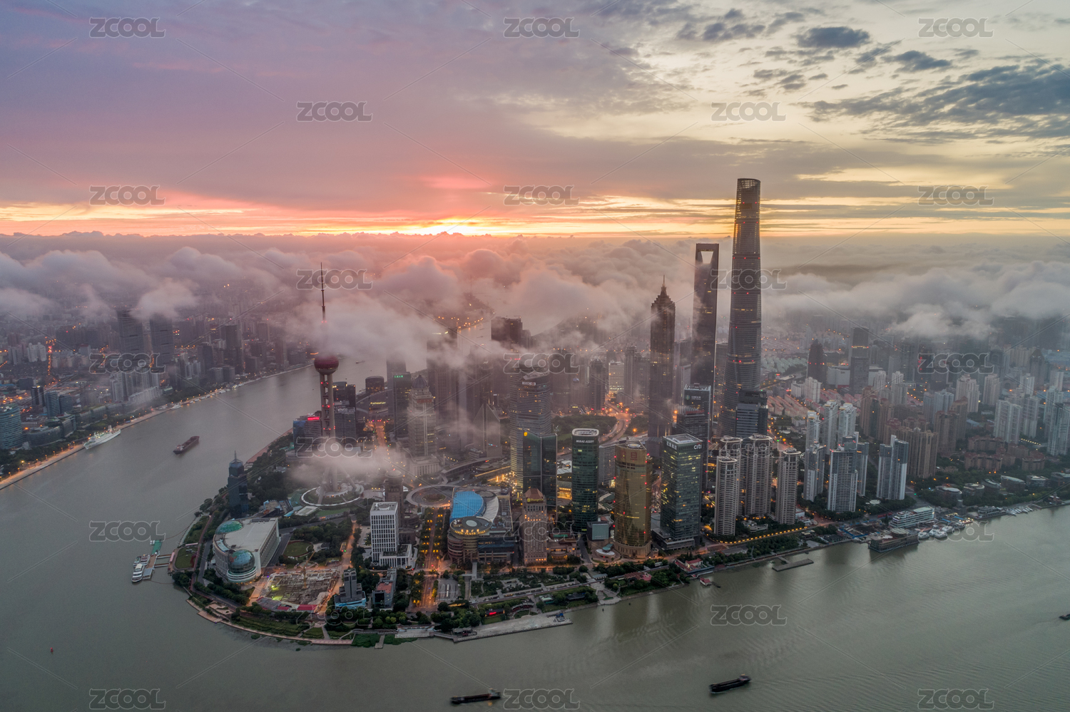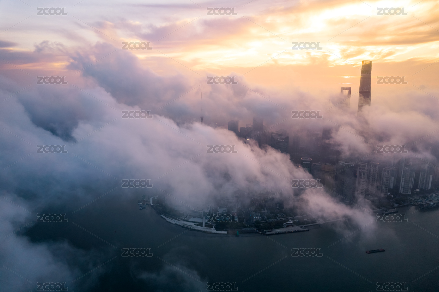 航拍日出时被云雾环绕的陆家嘴建筑群