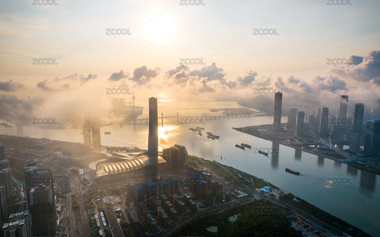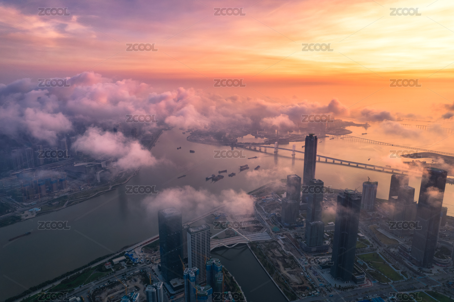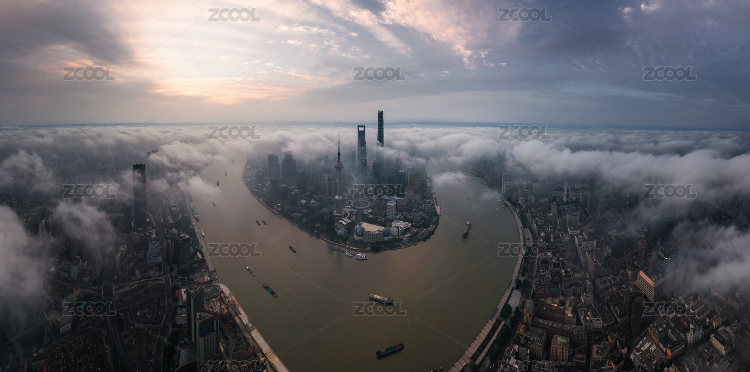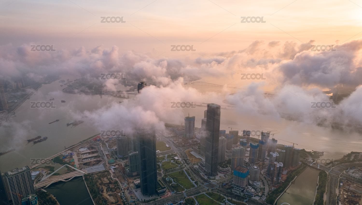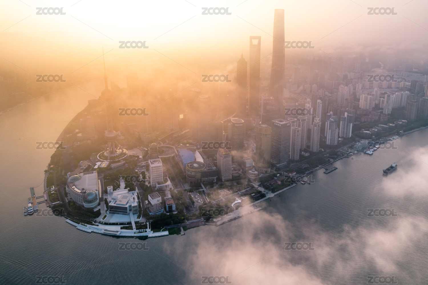 航拍日出时被云雾环绕的陆家嘴建筑群