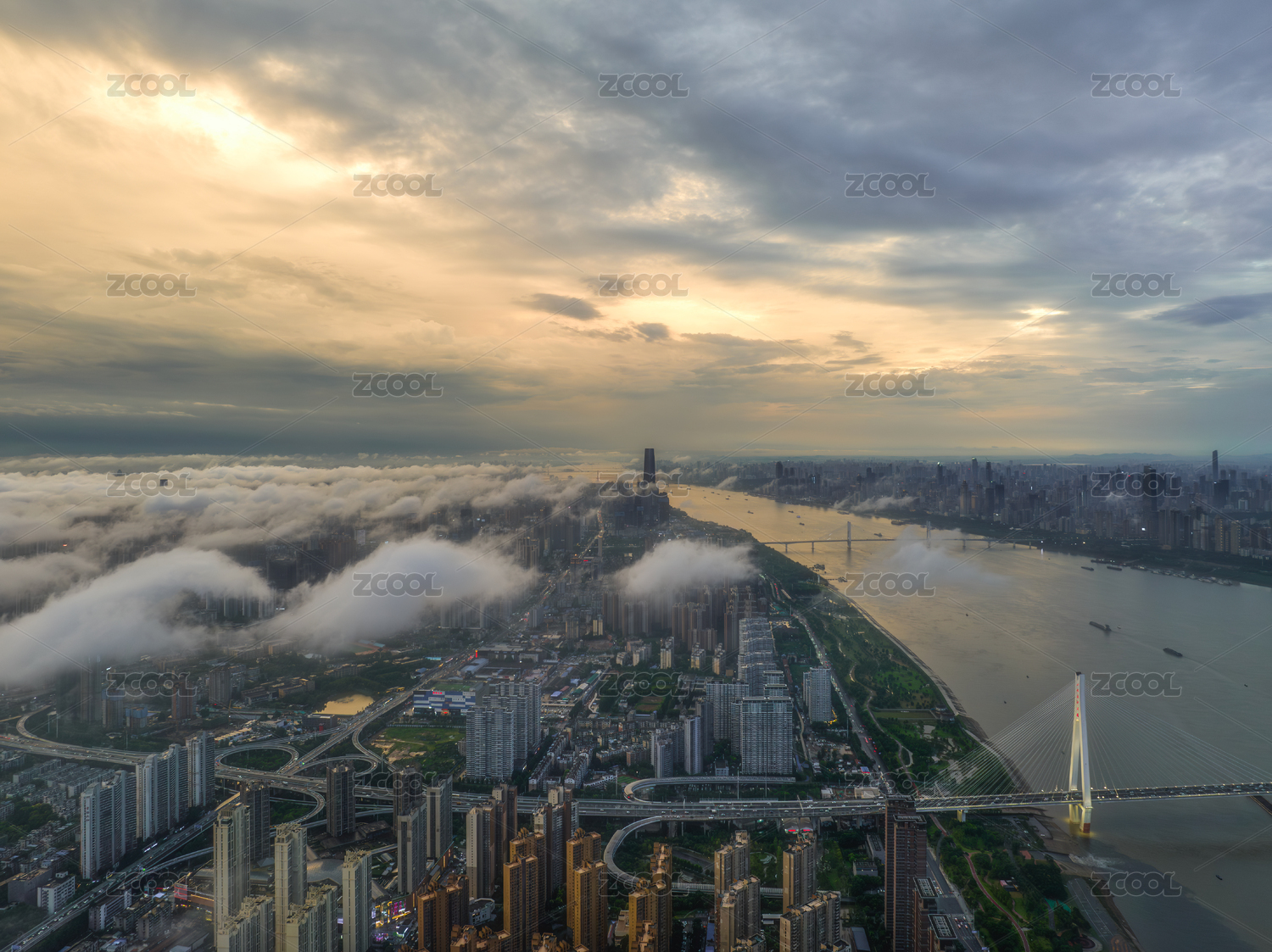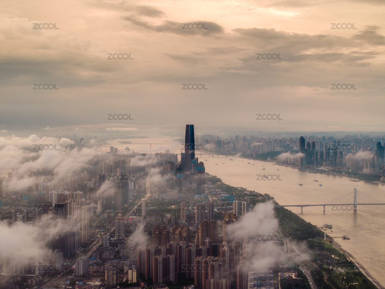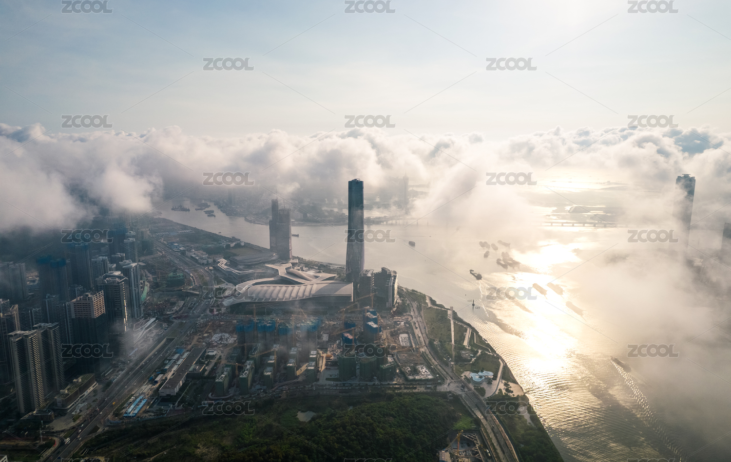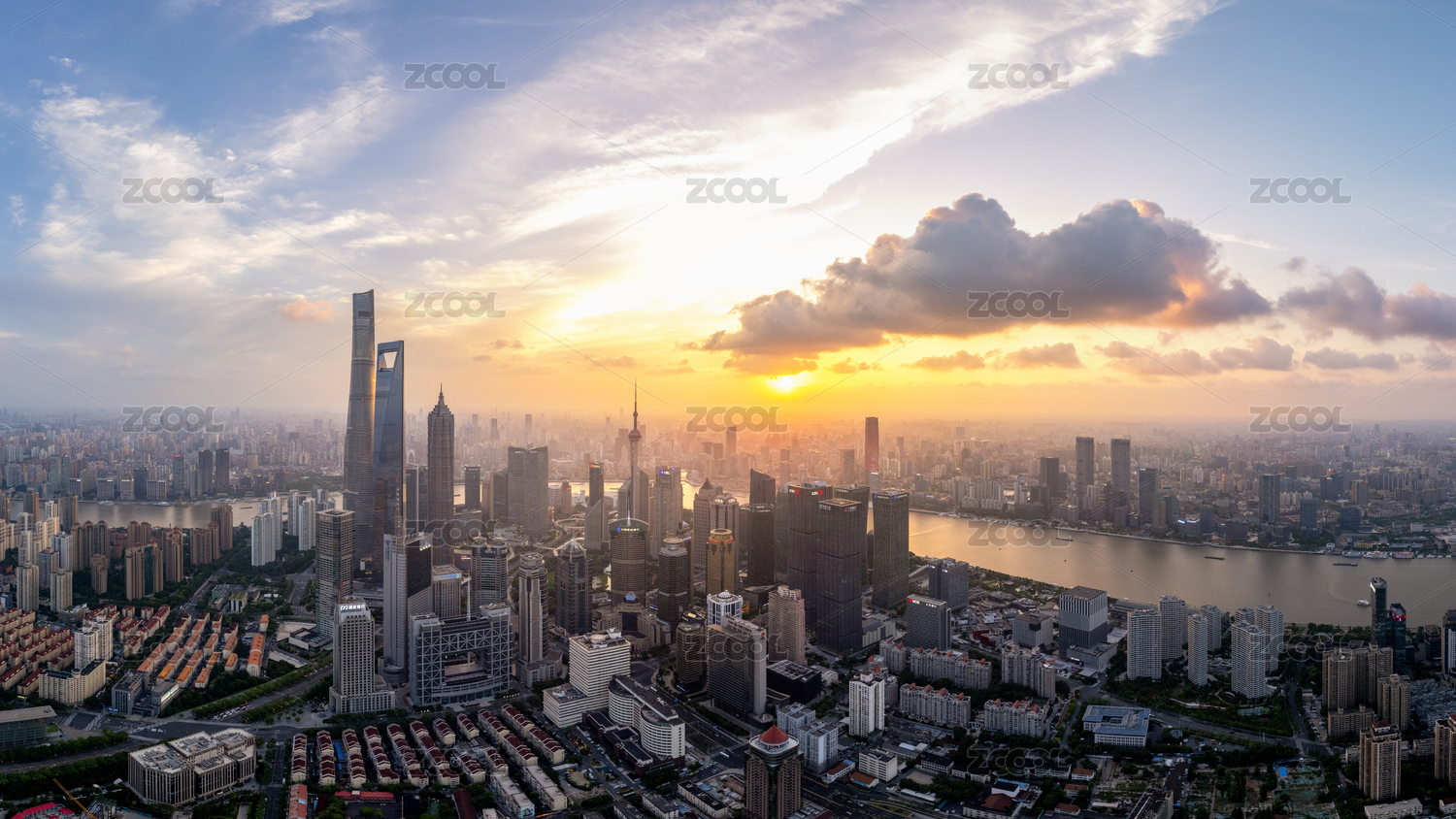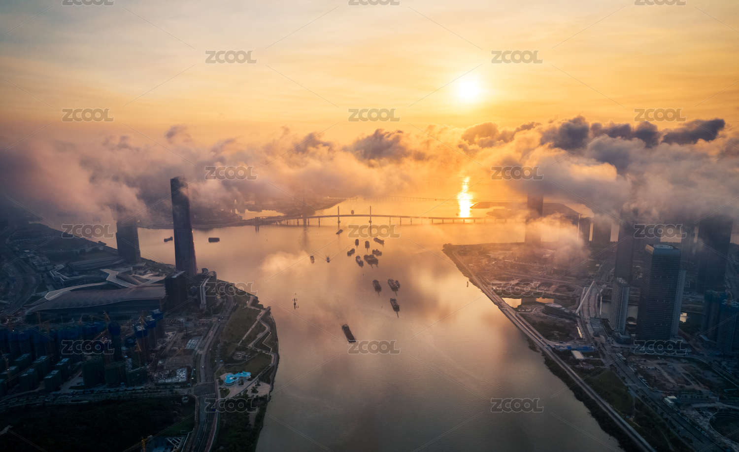 航拍日出时被云雾环绕的陆家嘴建筑群