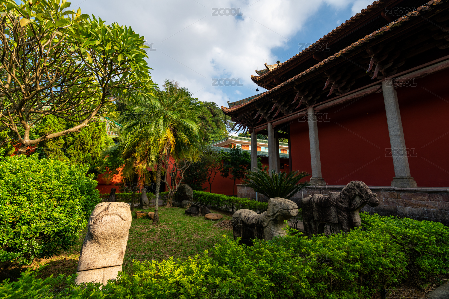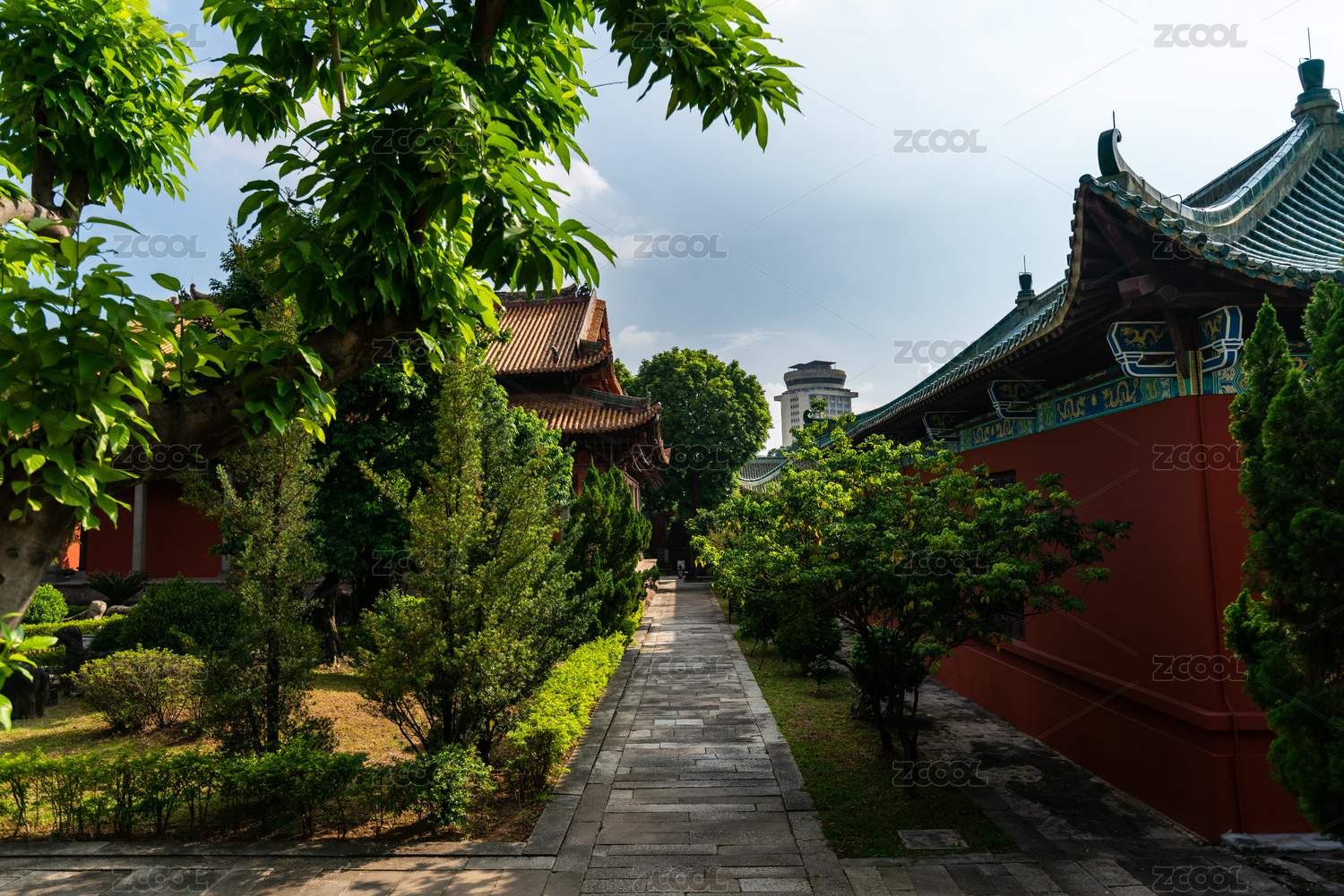 中国福建省福州西禅寺的蓝天绿树古建筑