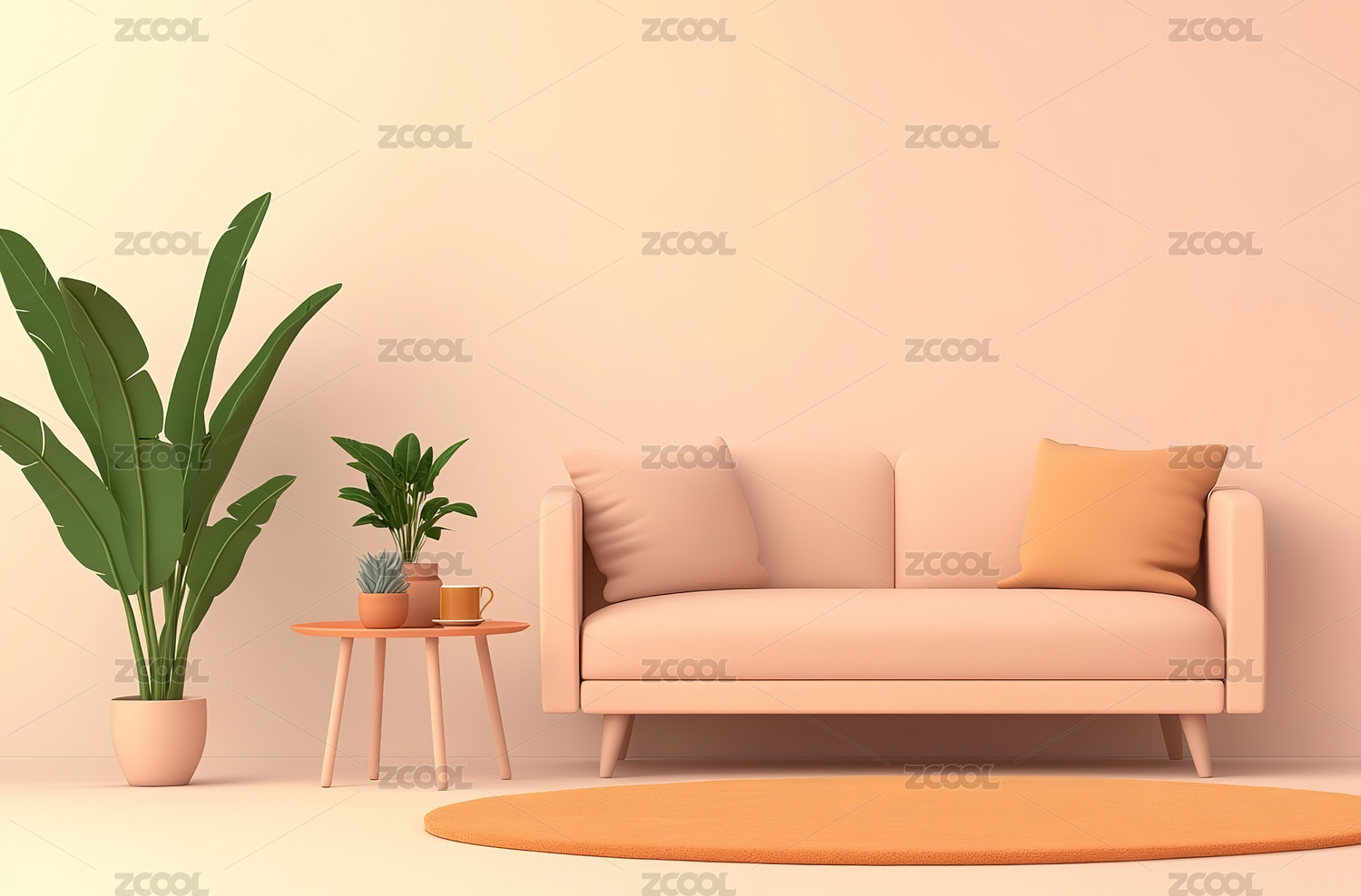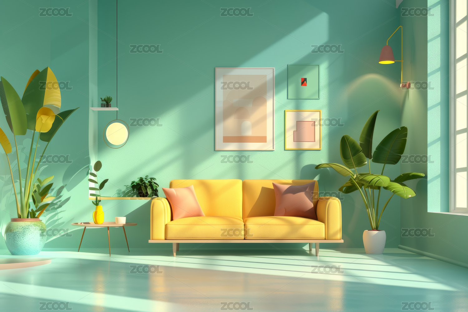 3D,卡通,立体,室内,沙发,家具,客厅,植物,清新,简约