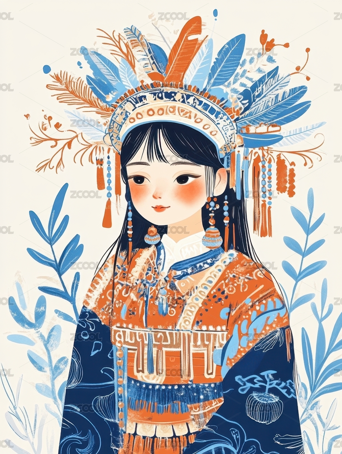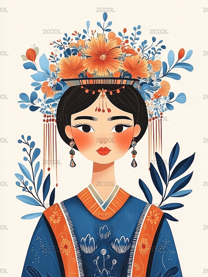 少数民族服装的女孩卡通插图