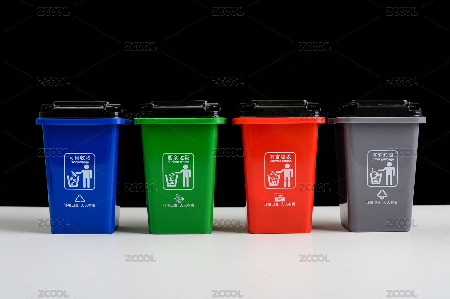 白背景上四个环保分类垃圾桶