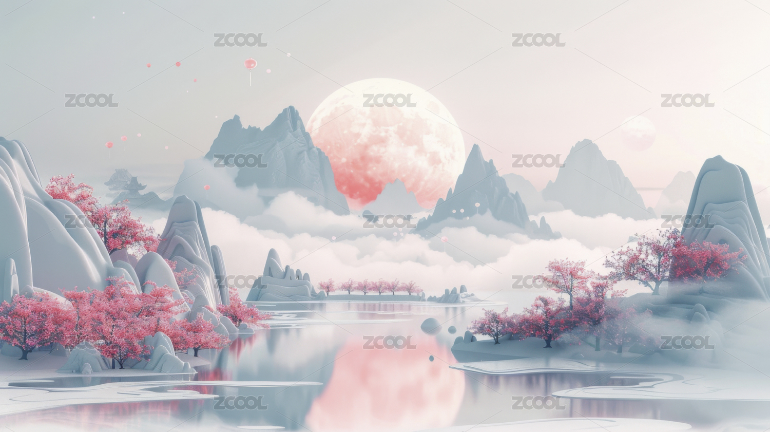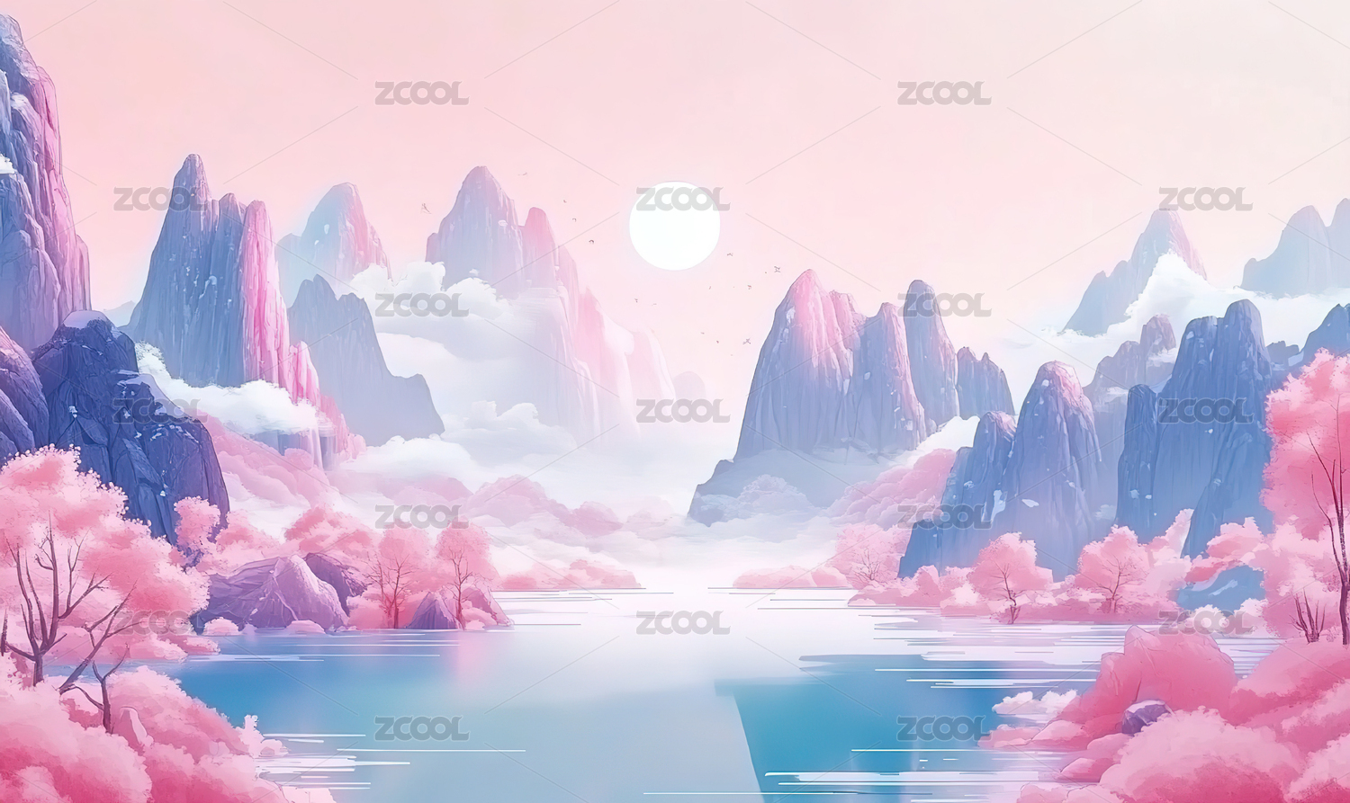 风景,地形,水,云,高山,反射,宁静,日落,AI数字艺术