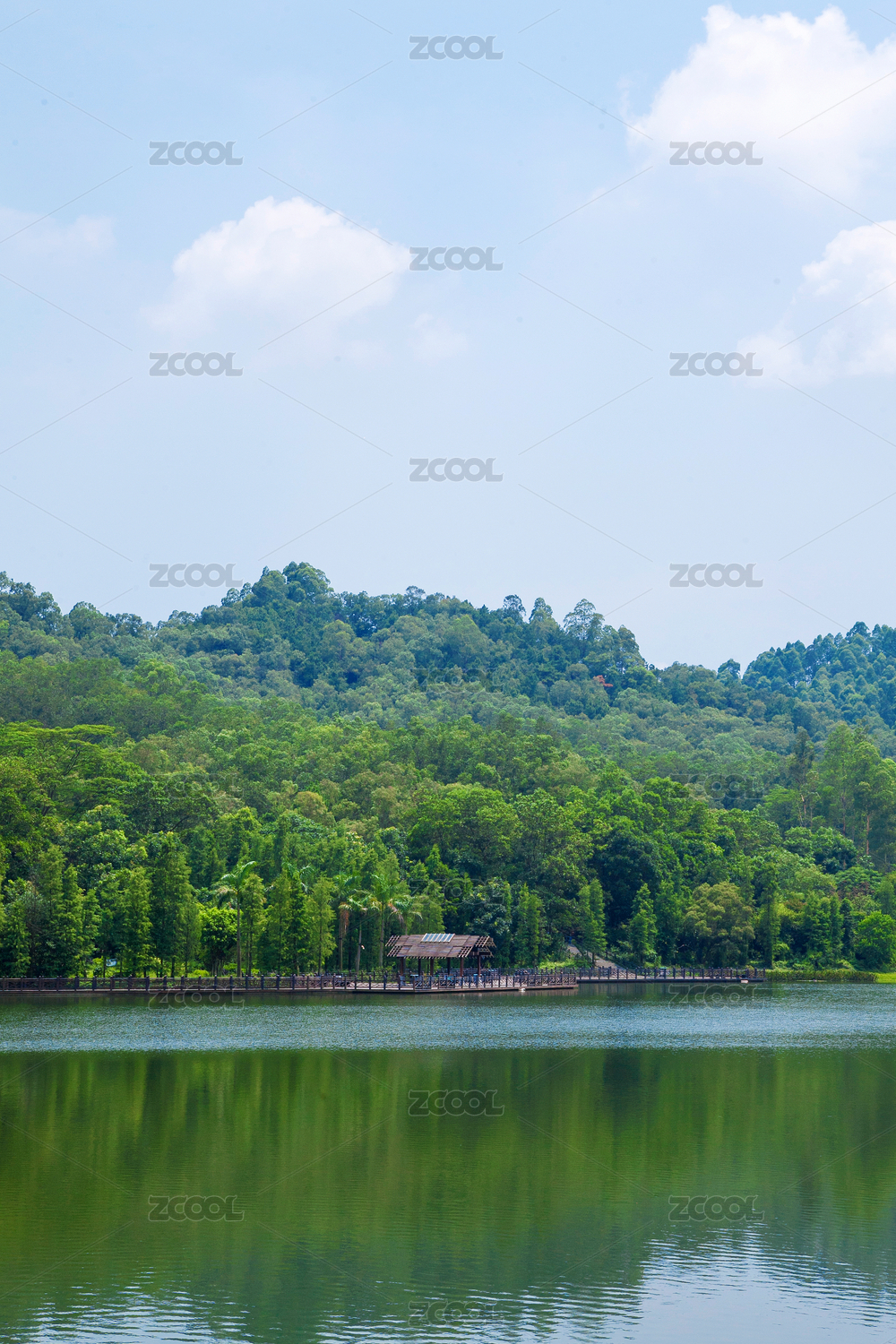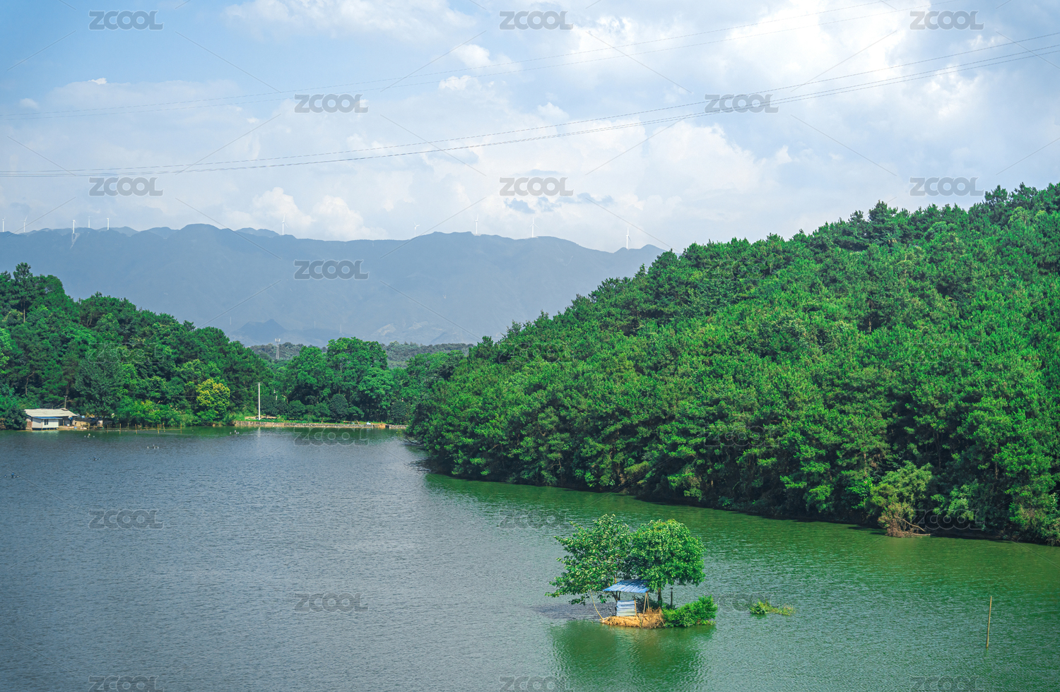 福建漳州华安贡鸭山中的湖畔竹林与山峦