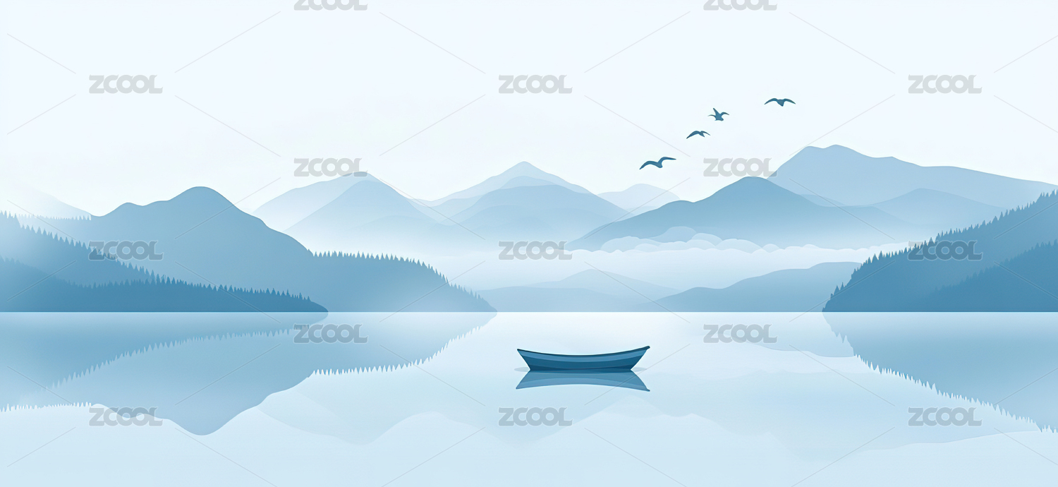 小船静泊湖面远山如黛