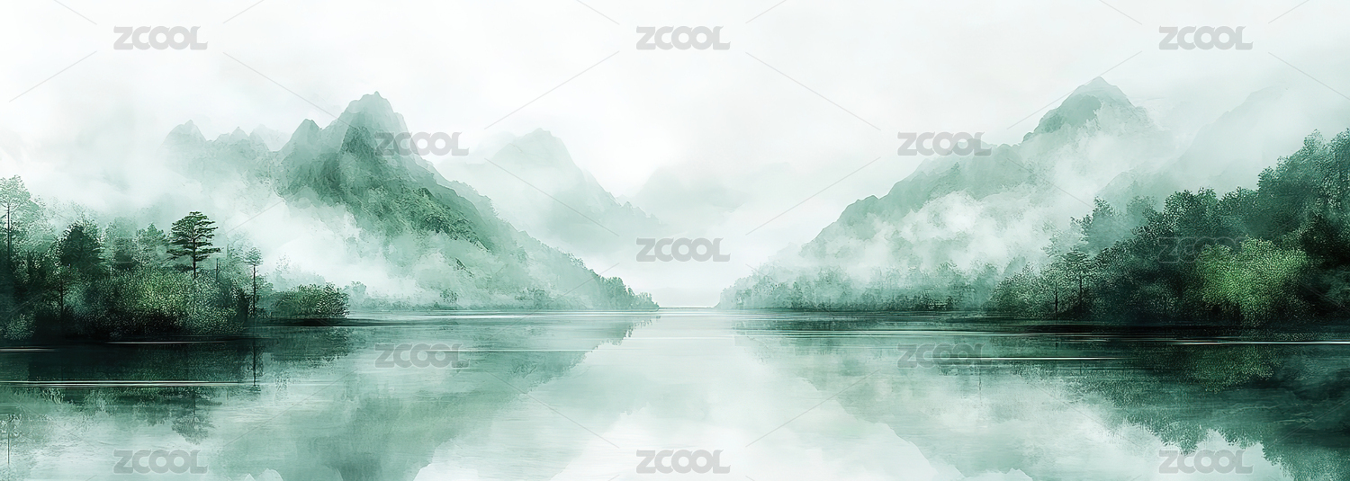 薄雾山峦与平静湖面