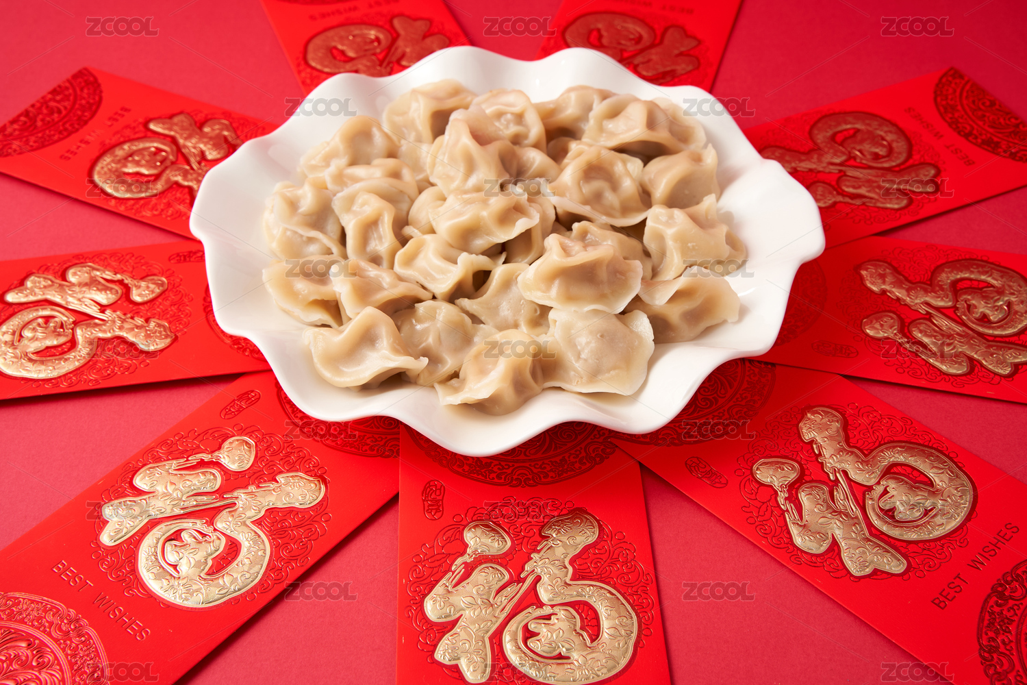 喜庆红色背景上的一盘饺子