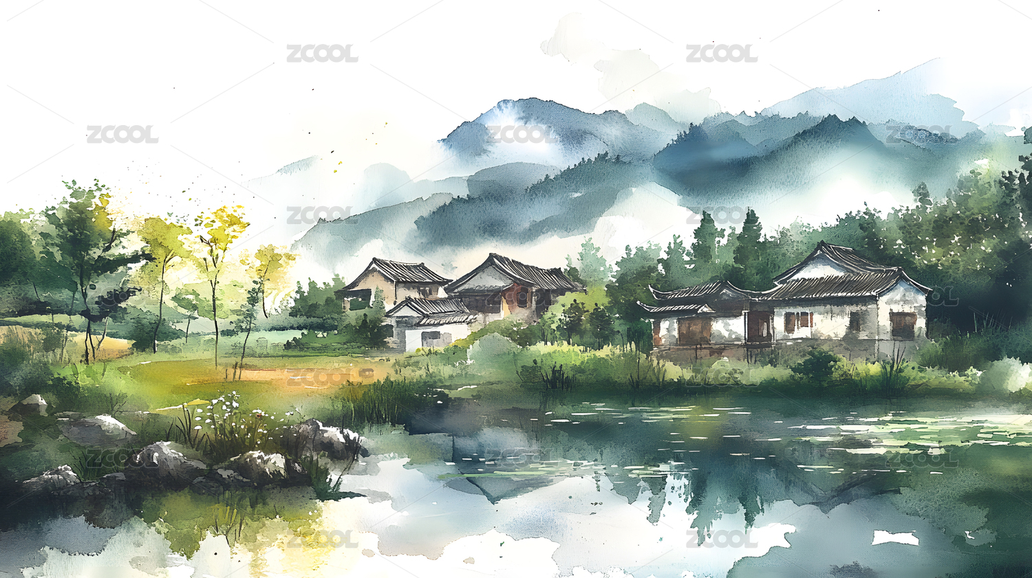 水彩风格江南乡村古镇