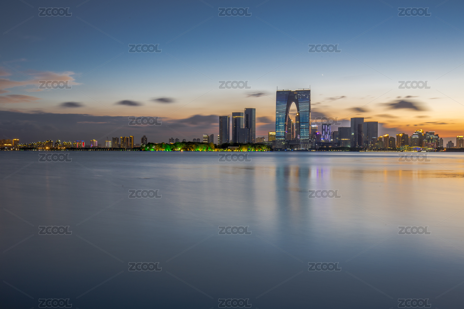中国江苏省苏州市金鸡湖边的现代城市建筑天际线