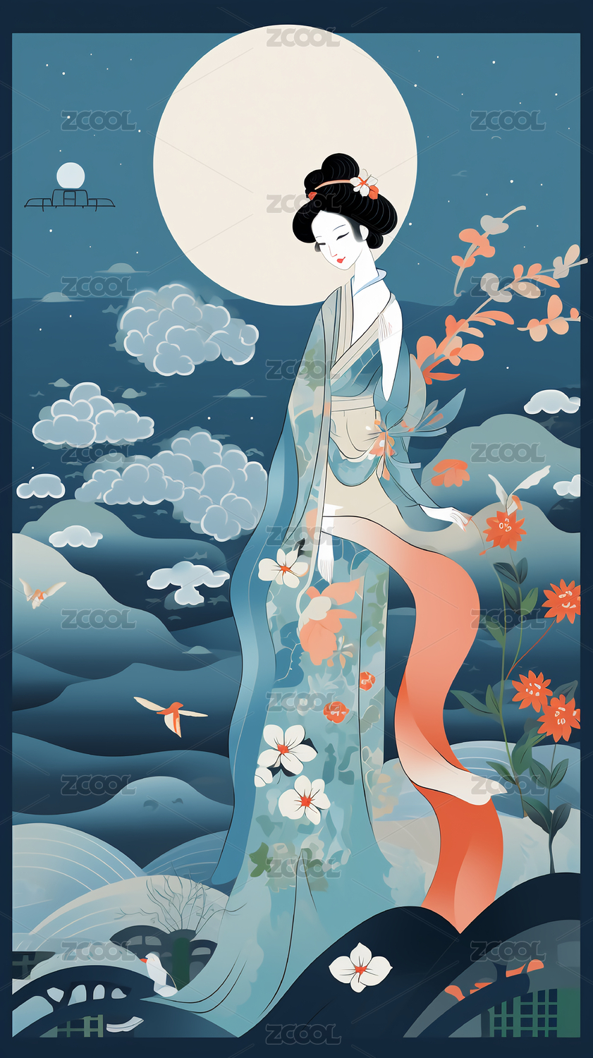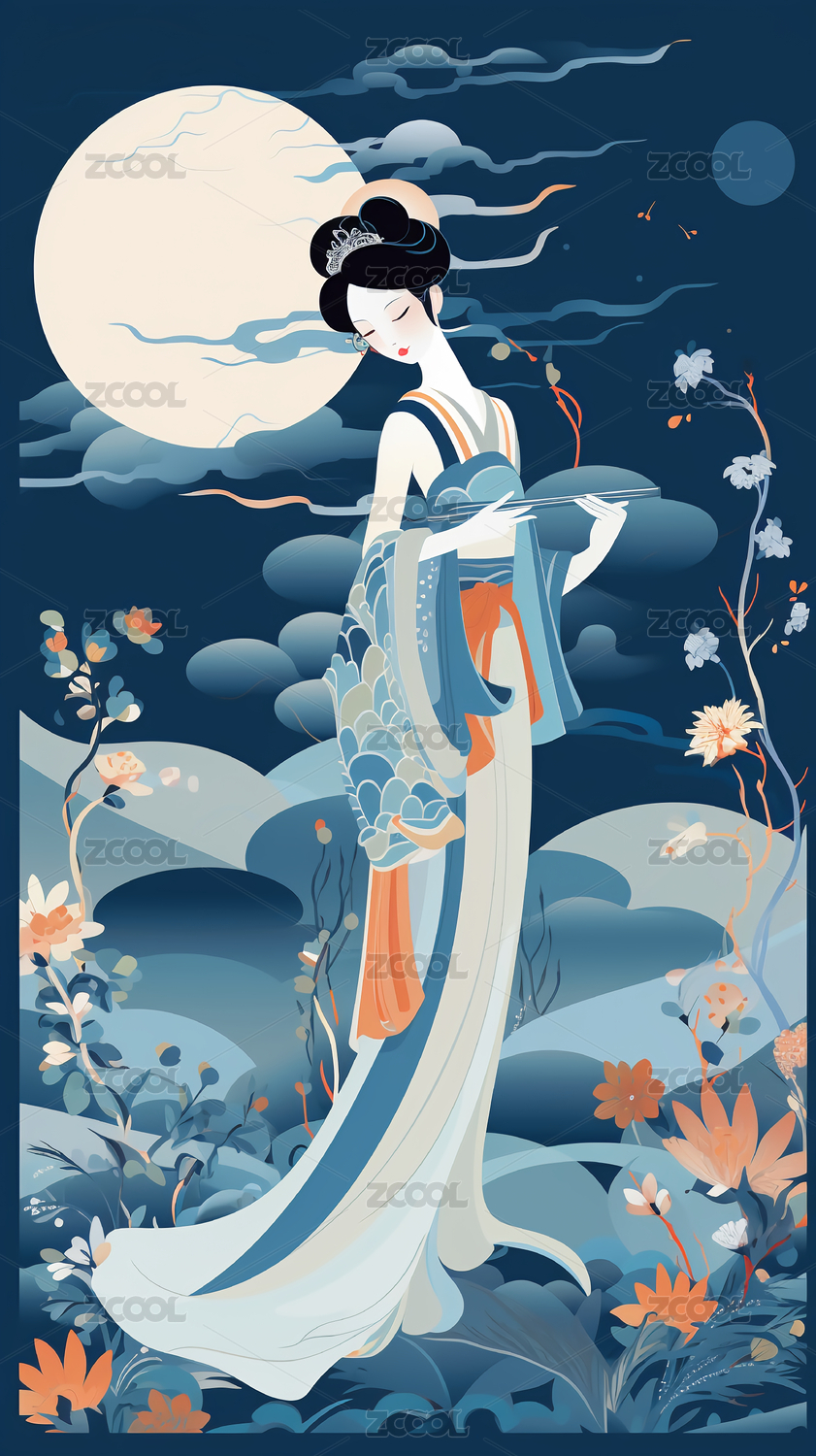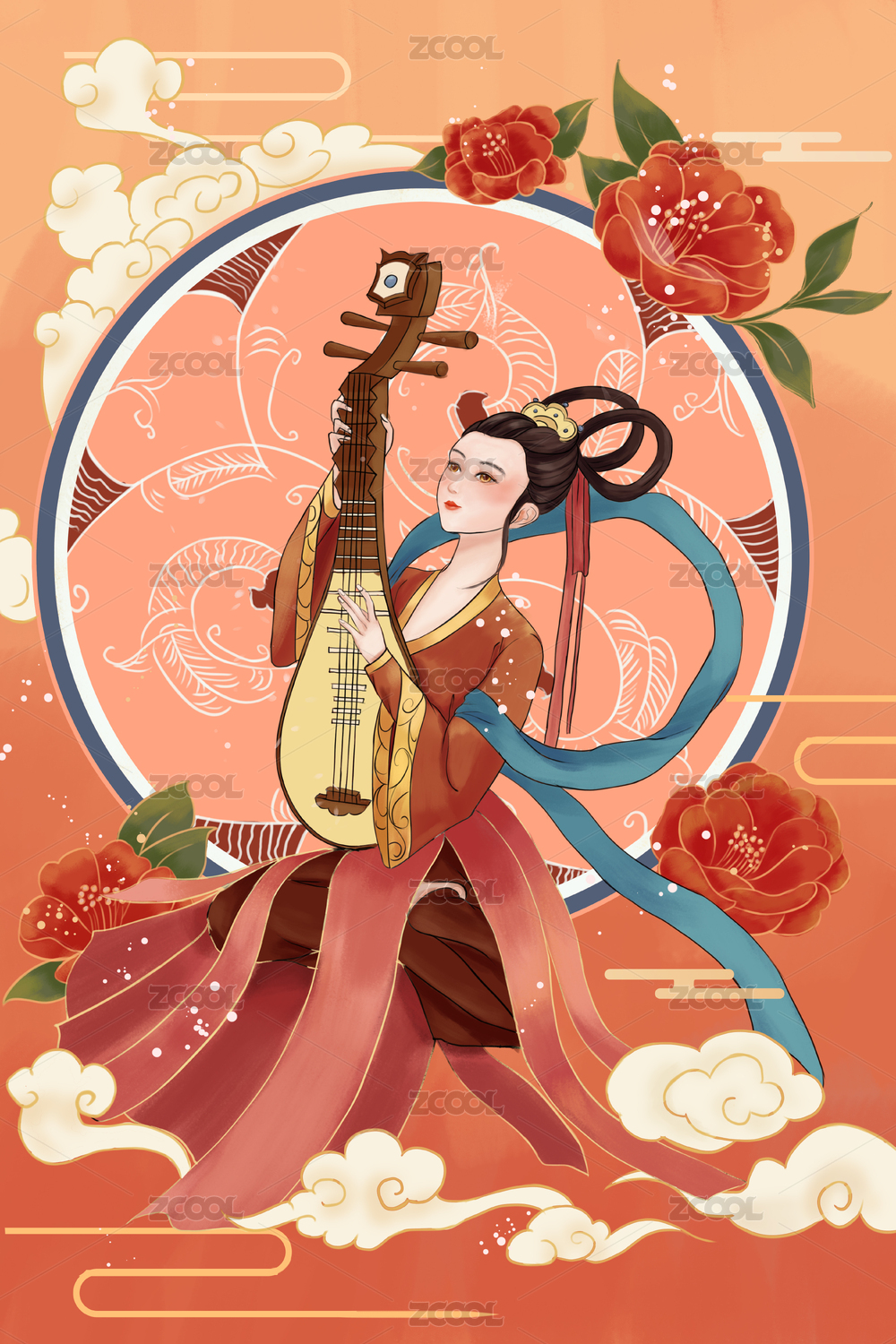 河边怀抱乐器的唐朝美女和锦鲤国风插画