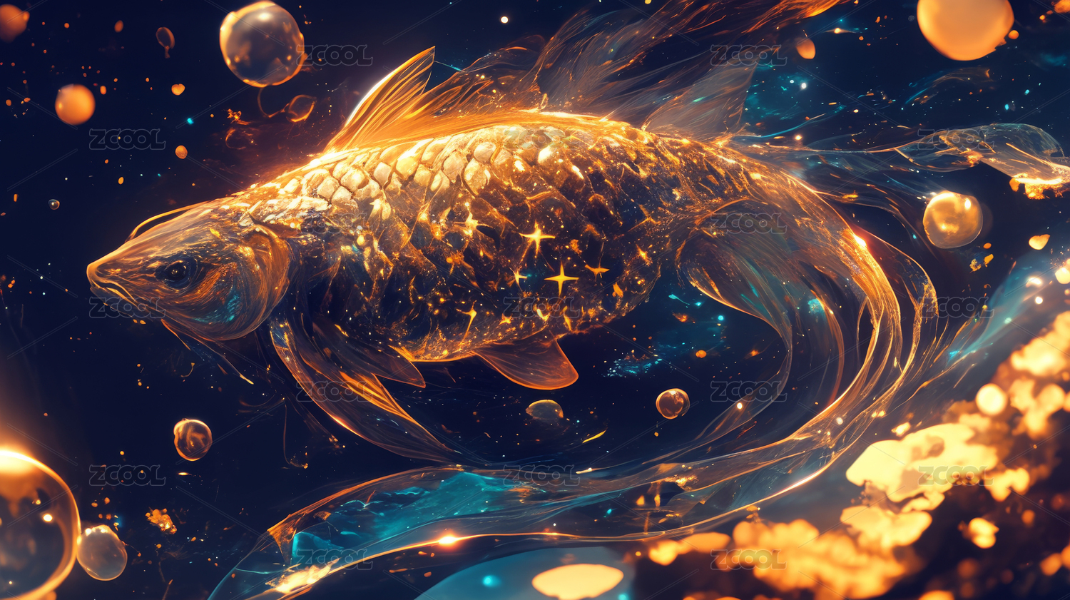 奇幻神话黑底动感灵动发光鲤鱼3D立体插画