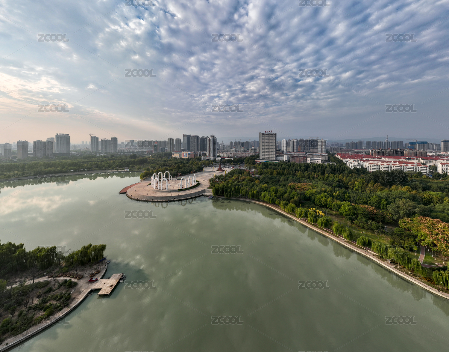 航拍郑州雕塑公园西流湖城市绿地滨湖景观带