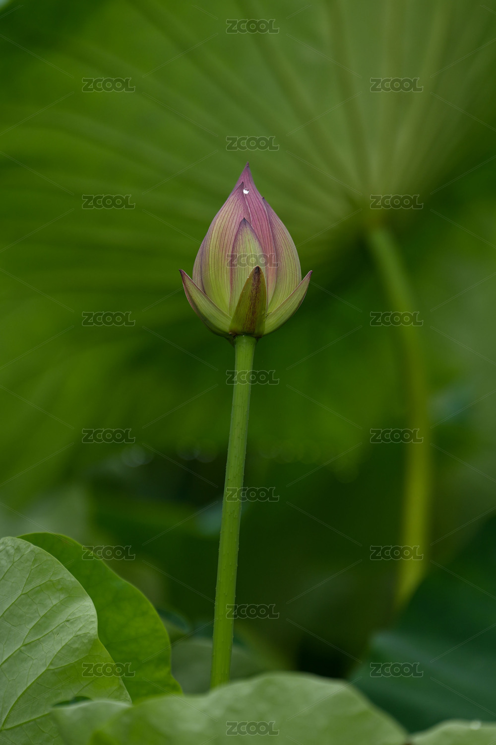 夏天荷塘绿色荷叶及粉红色荷花花苞特写