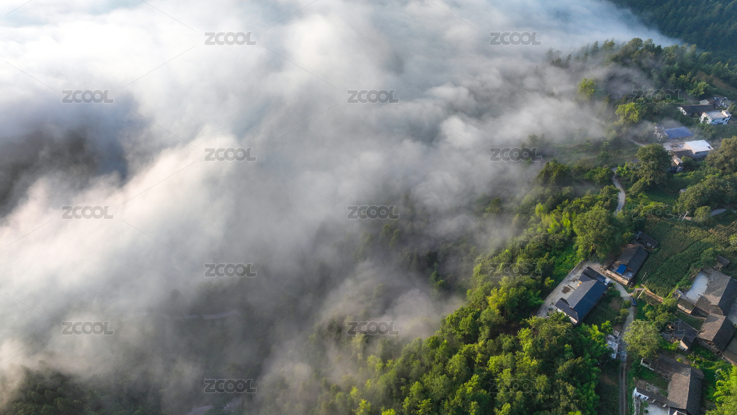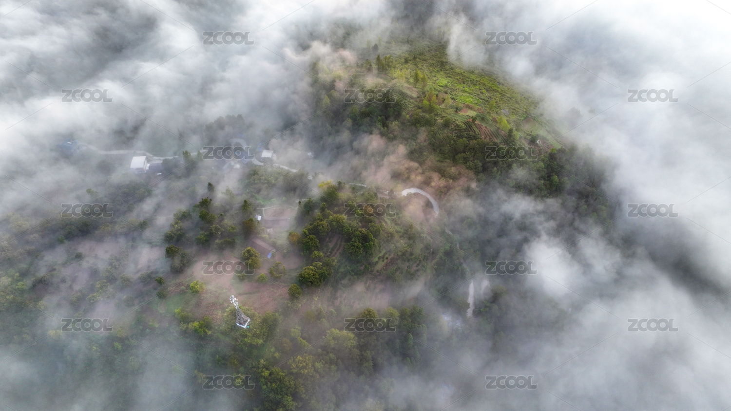 中国湖北宜昌柏家坪村雨后清晨航拍