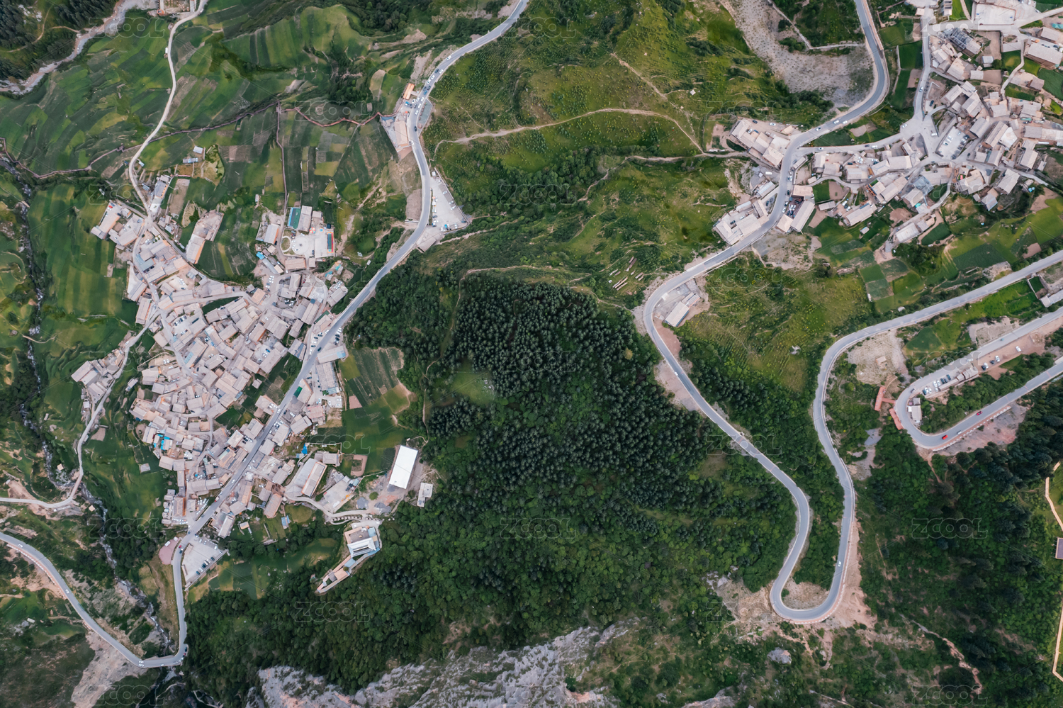 航拍,山区,乡村,田园风光,村落建筑,自然和谐,耕作文化,丘陵曲线,绿意盎然,传统民居