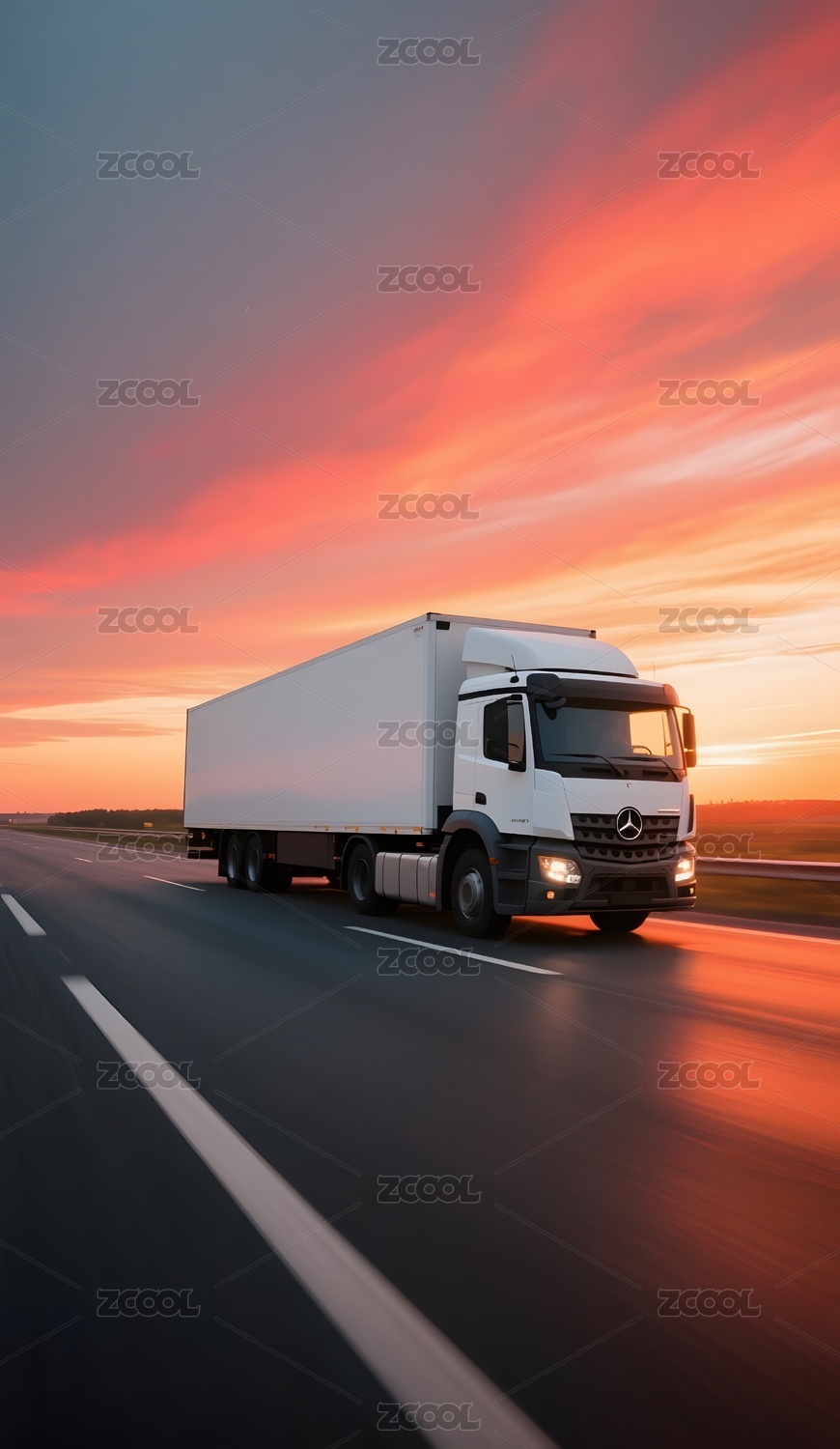 公路上行驶的货运卡车与日落