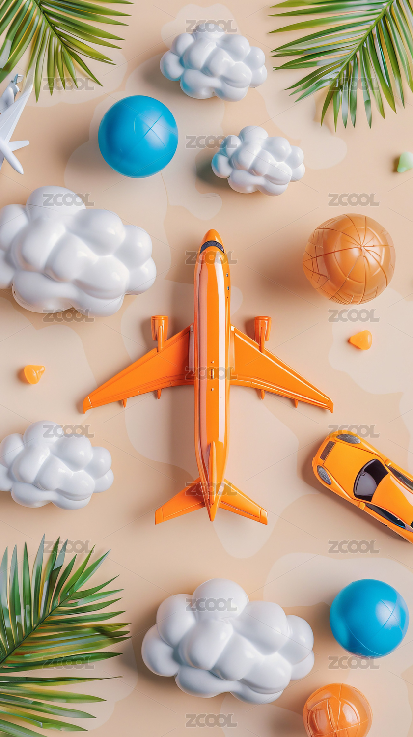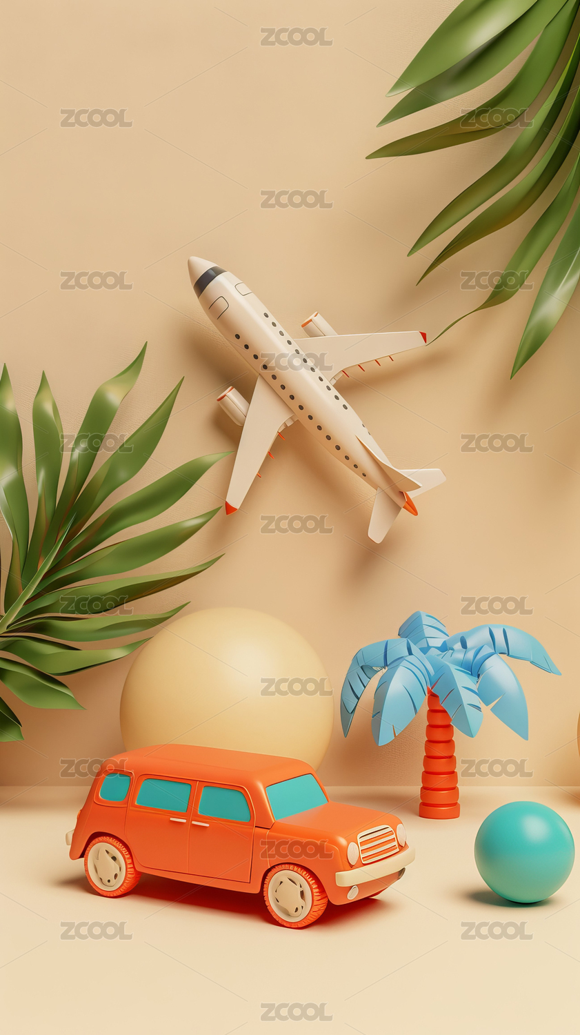 3D,飞机,汽车,玩具,棕榈叶,橙色,旅行,塑料,车,米色