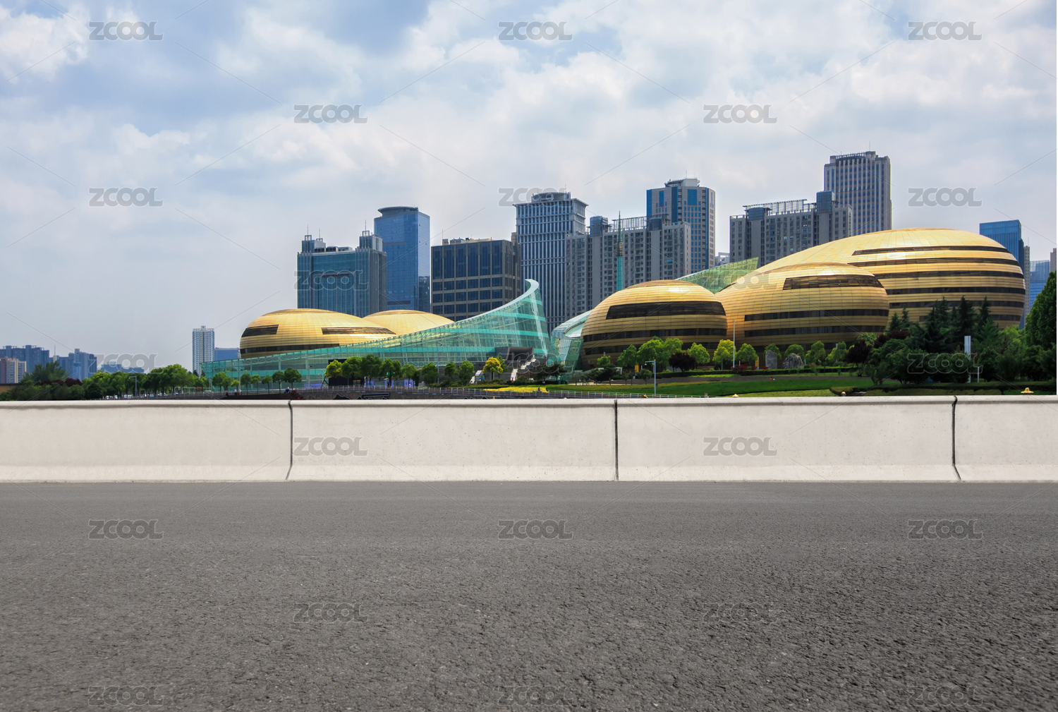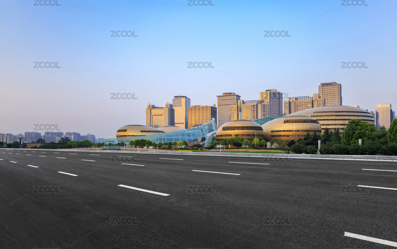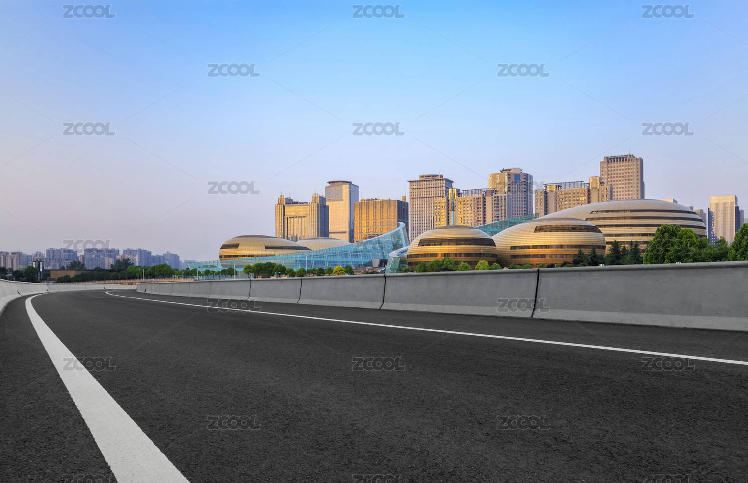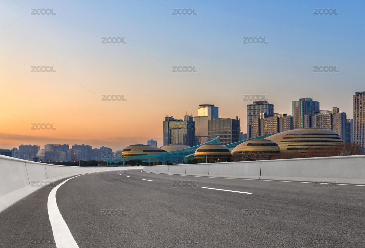黄昏时分,前景为沥青道路的郑州城市景观和城市天际线