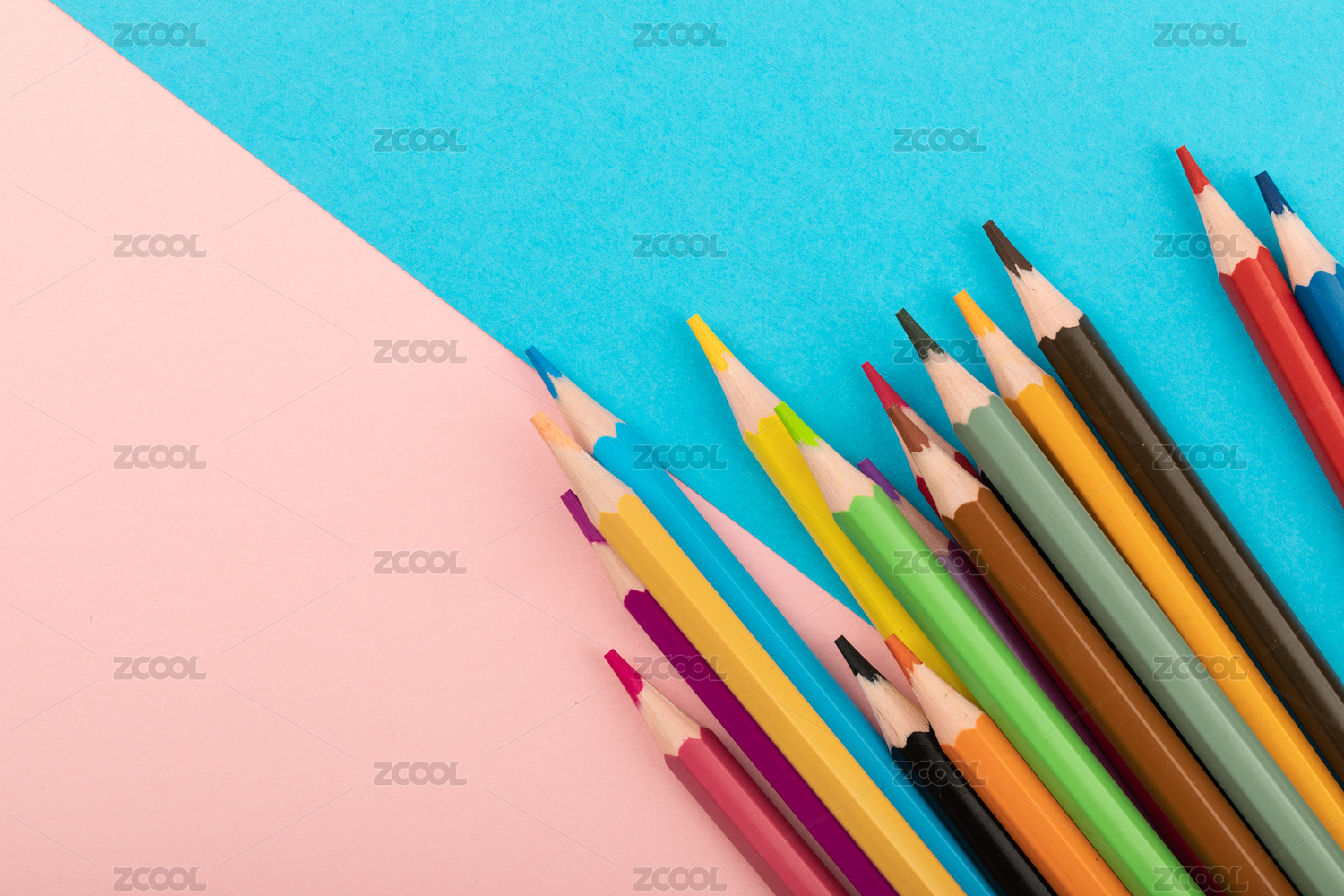 拼色背景上的各色彩色铅笔组合