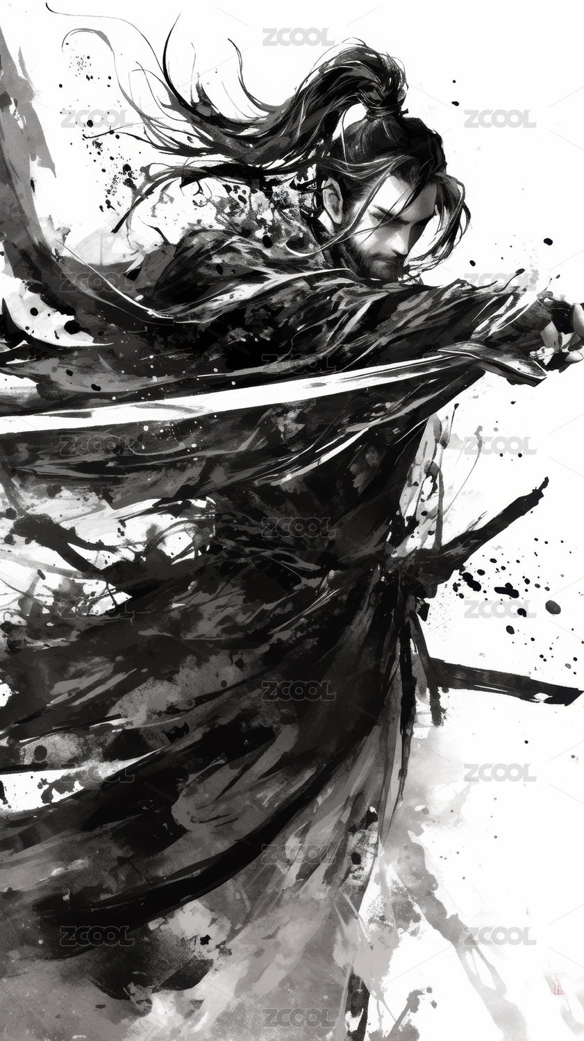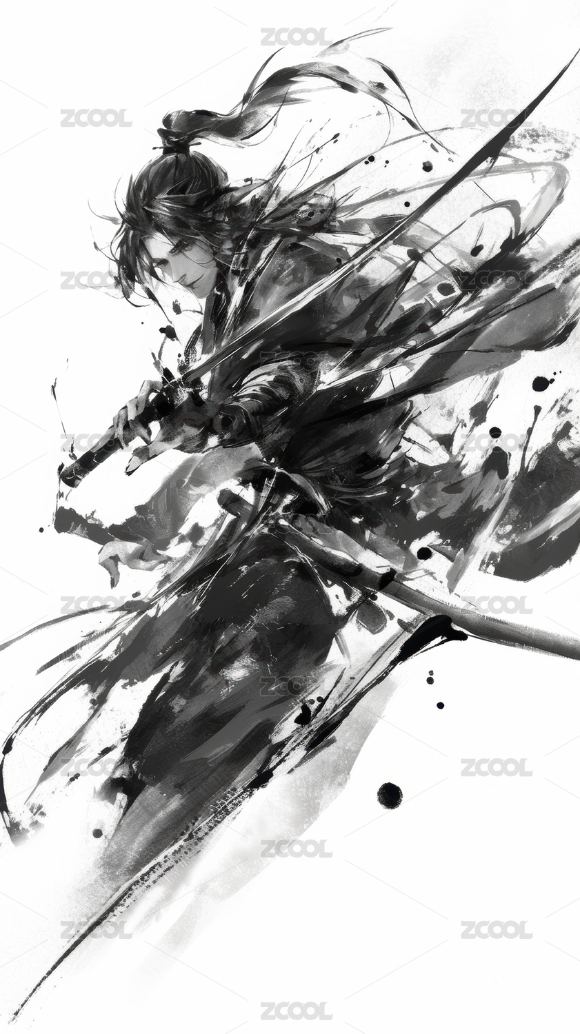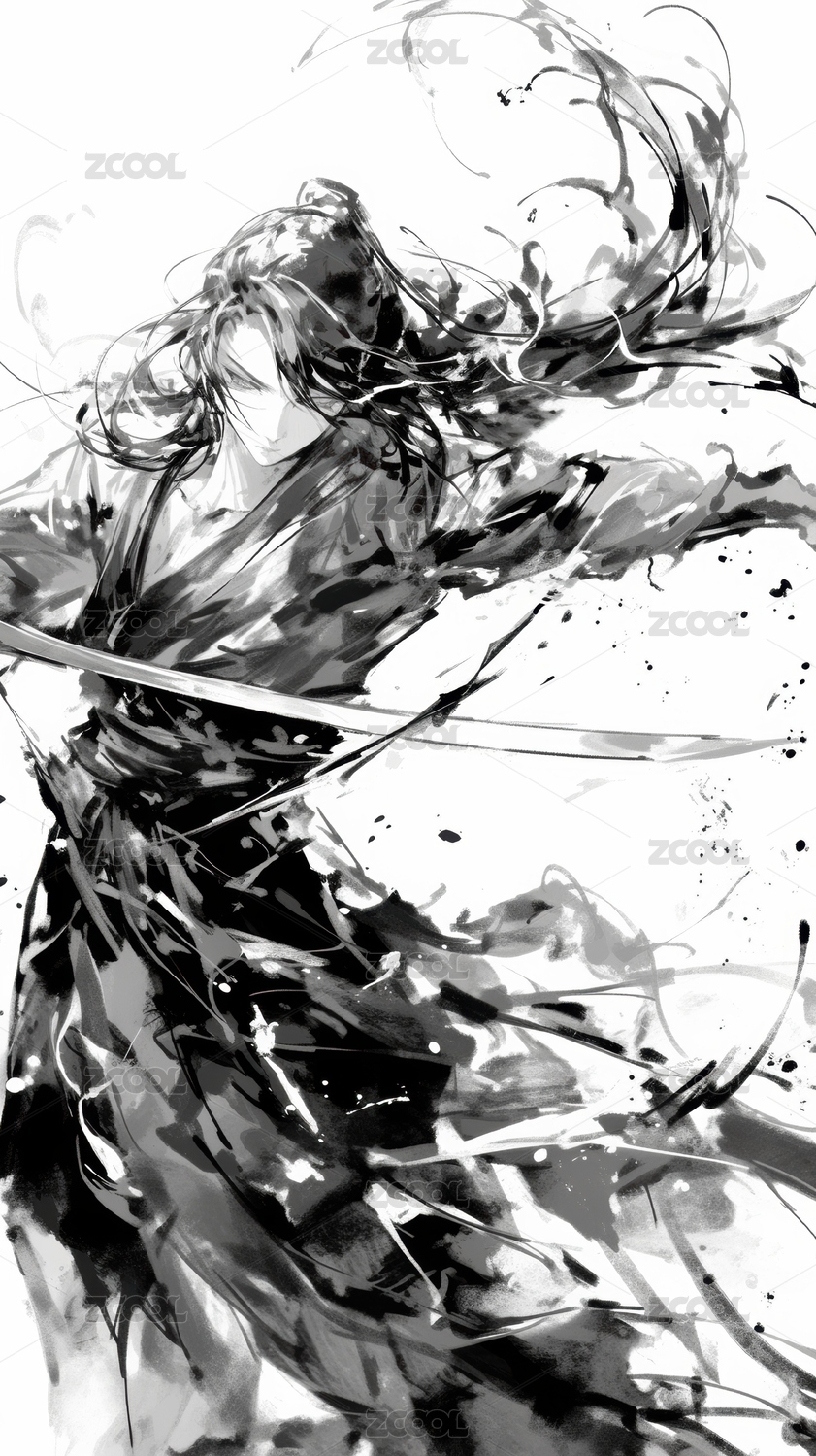 动漫武侠人物少侠拿着长刀黑白国风插画