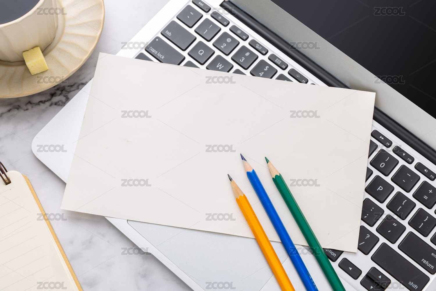 正上方视角特写书桌上放着笔记本电脑,铅笔和回形针等各种办公用品