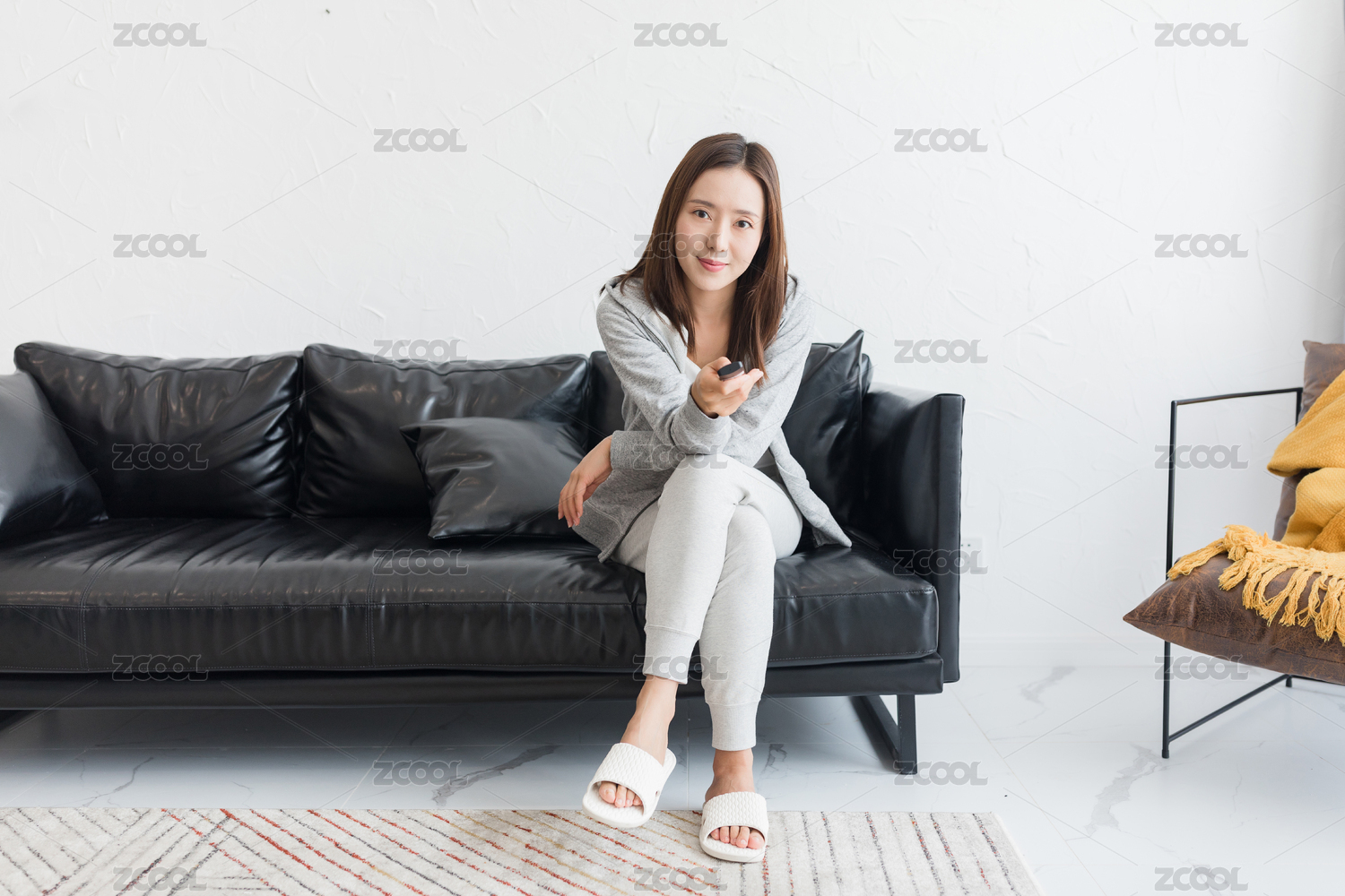 一个年轻女性坐在沙发上手拿遥控器看电视