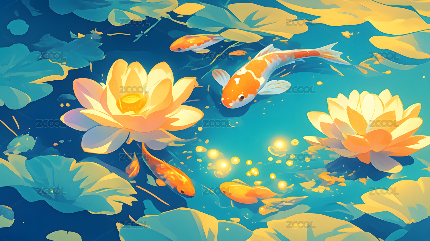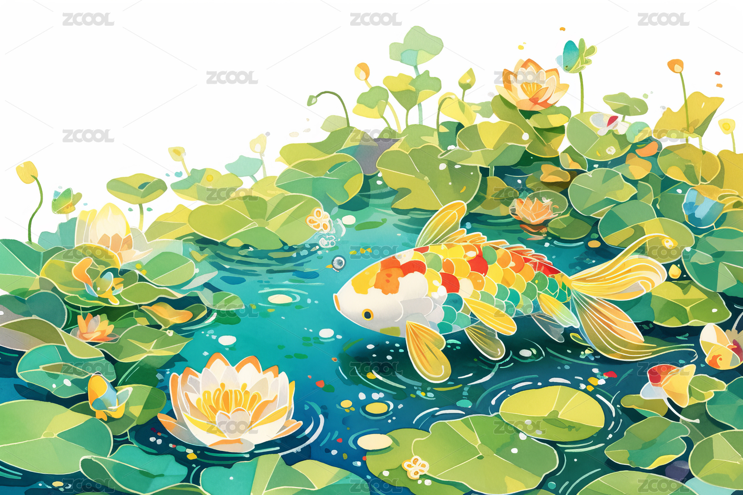 锦鲤,荷花池,游弋,宁静,池塘,色彩斑斓,鱼,插图,粉红色,白色