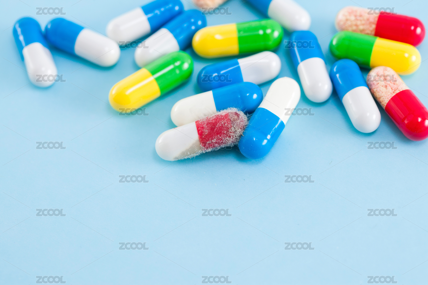 在蓝色背景上用于医疗治疗用中西药药丸胶囊