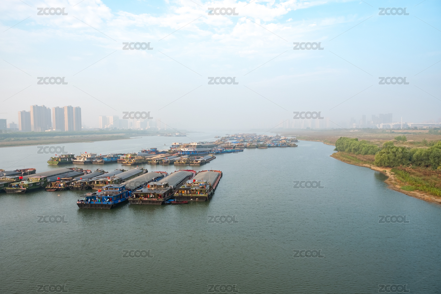 夏日俯瞰停靠在淮河的中国安徽省蚌埠市多艘渔船