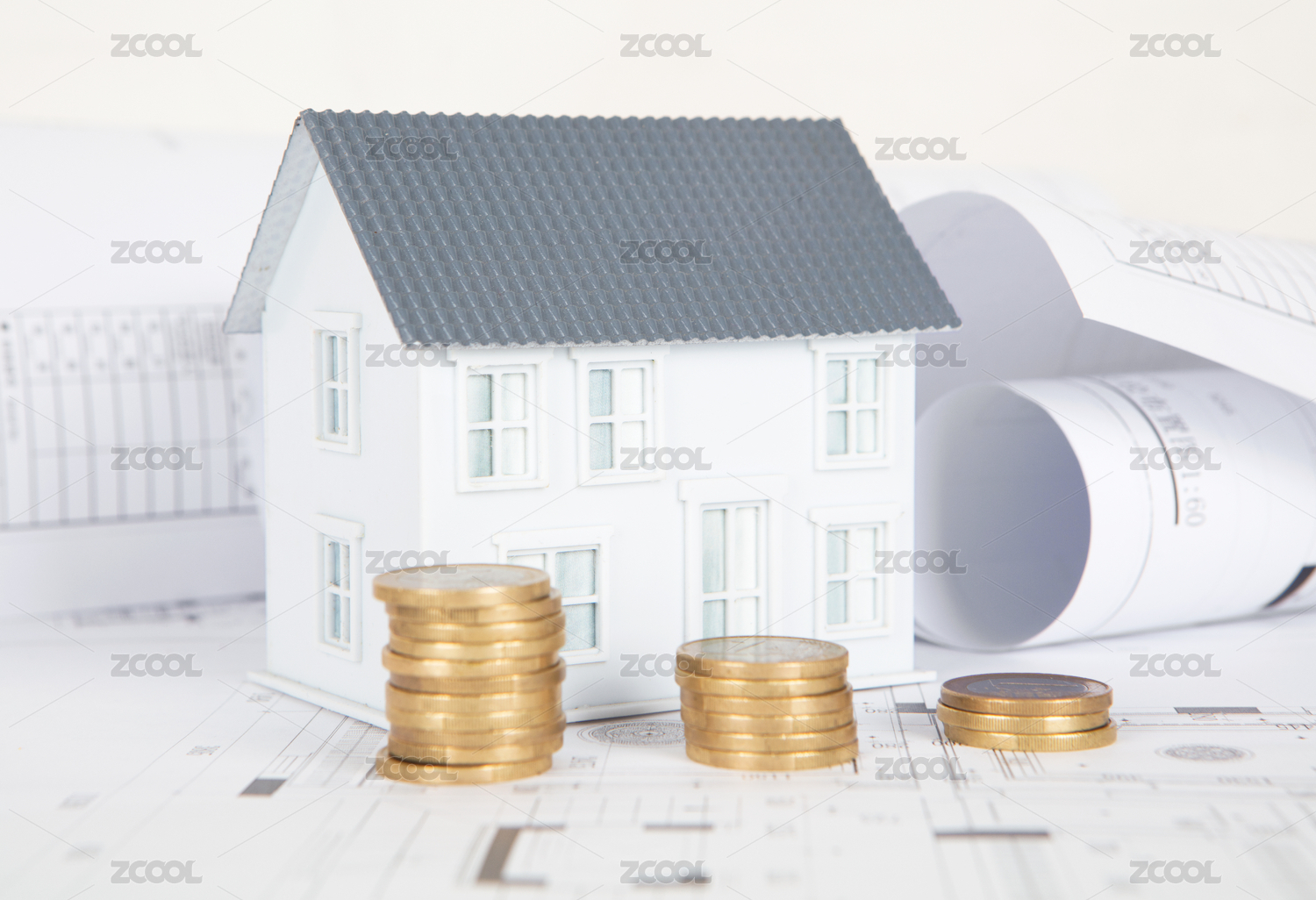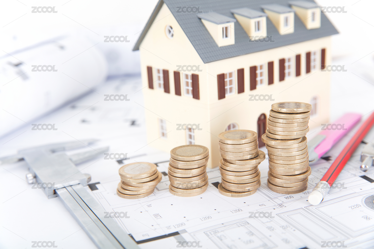 桌子上的图纸和图纸上的小房子模型及一排欧元硬币和相关工具