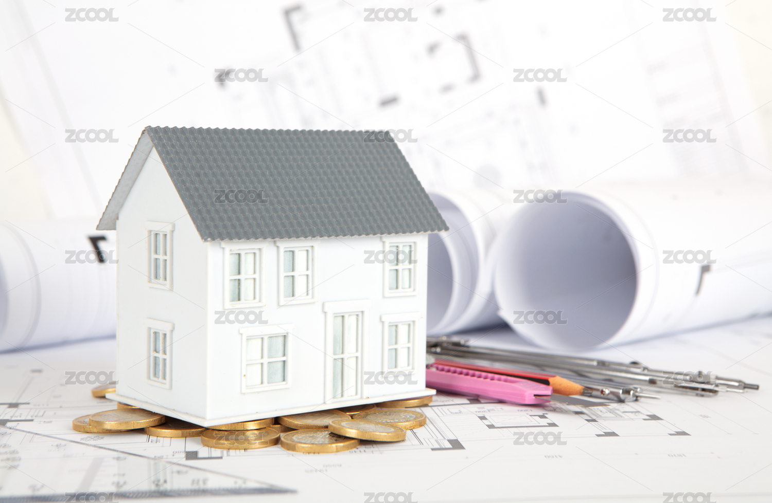 室内设计的工程图纸和小房子模型及一排欧元硬币和相关工具