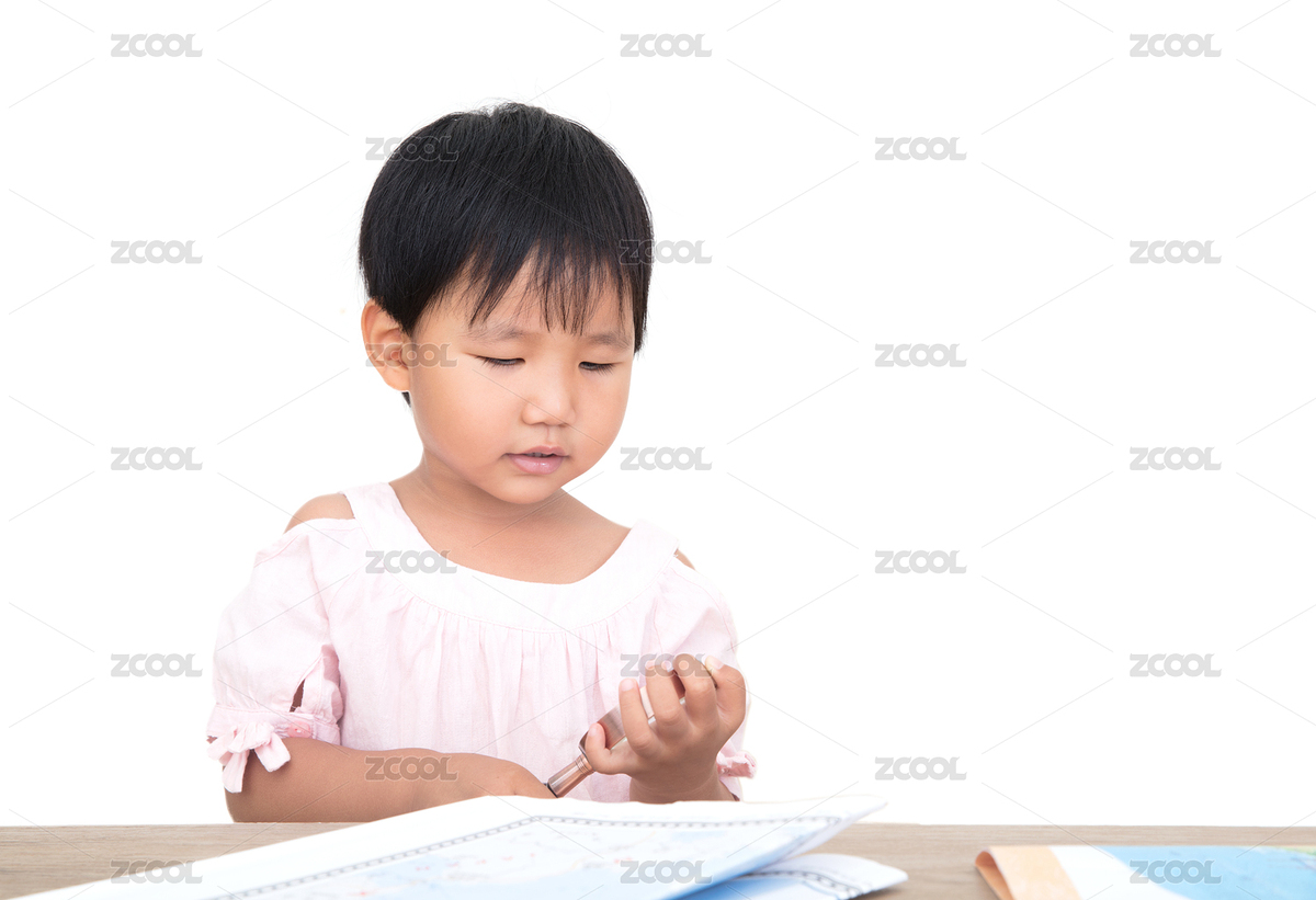 白背景前中国小女孩正在感兴趣的玩弄着一个放大镜