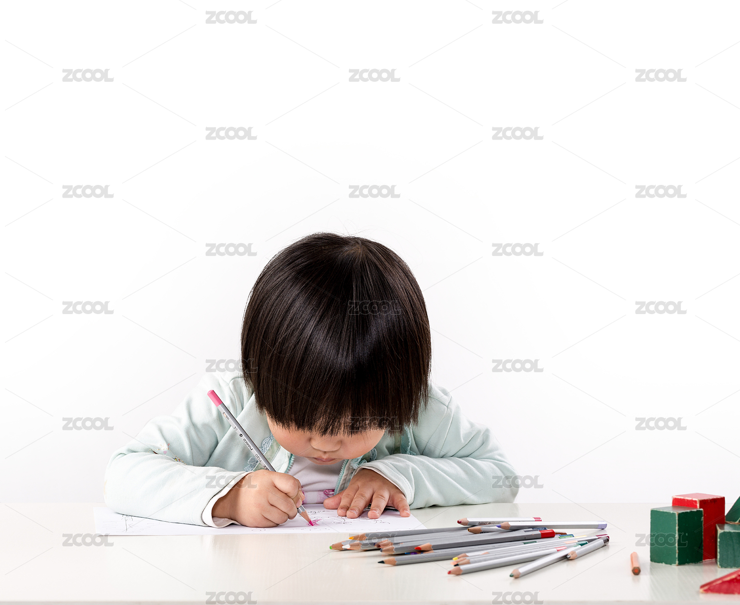 白背景前趴在桌子上手拿画笔画画的中国女孩