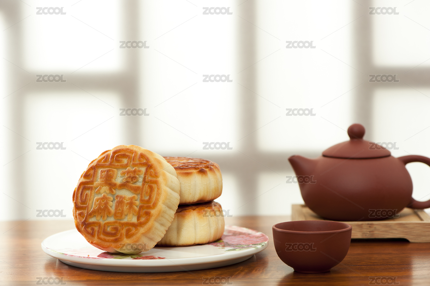 皎洁的月光背景下红木桌面摆放着月饼
