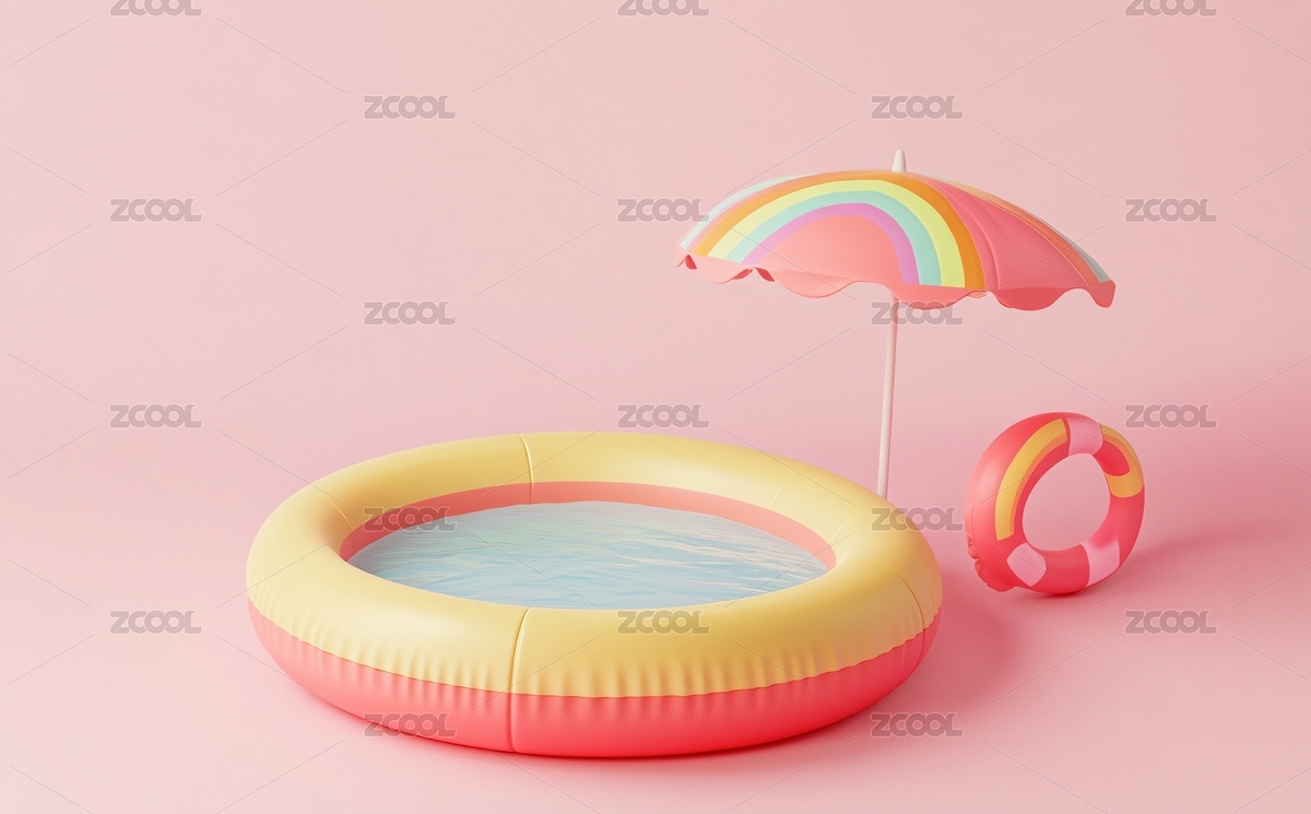 夏日度假概念沙滩上的游泳圈遮阳伞3D背景