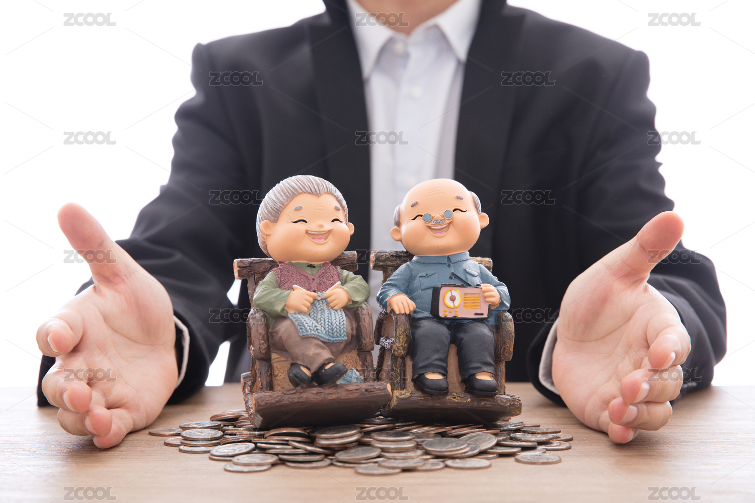 穿着正装的男性双手呵护着放在美元硬币上的老两口模型