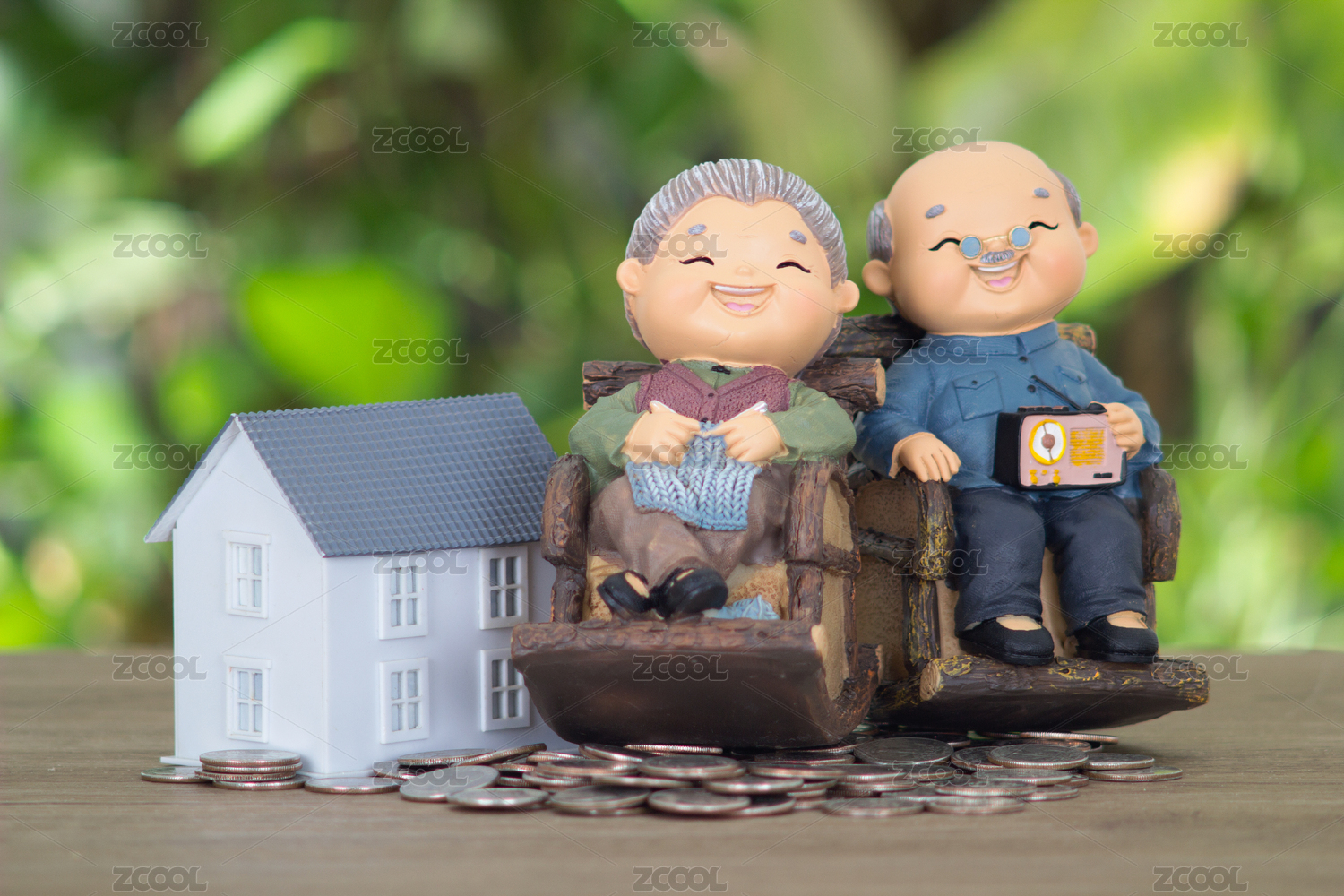 老头和老婆模型放在一堆美元硬币上及旁边一个小房子模型