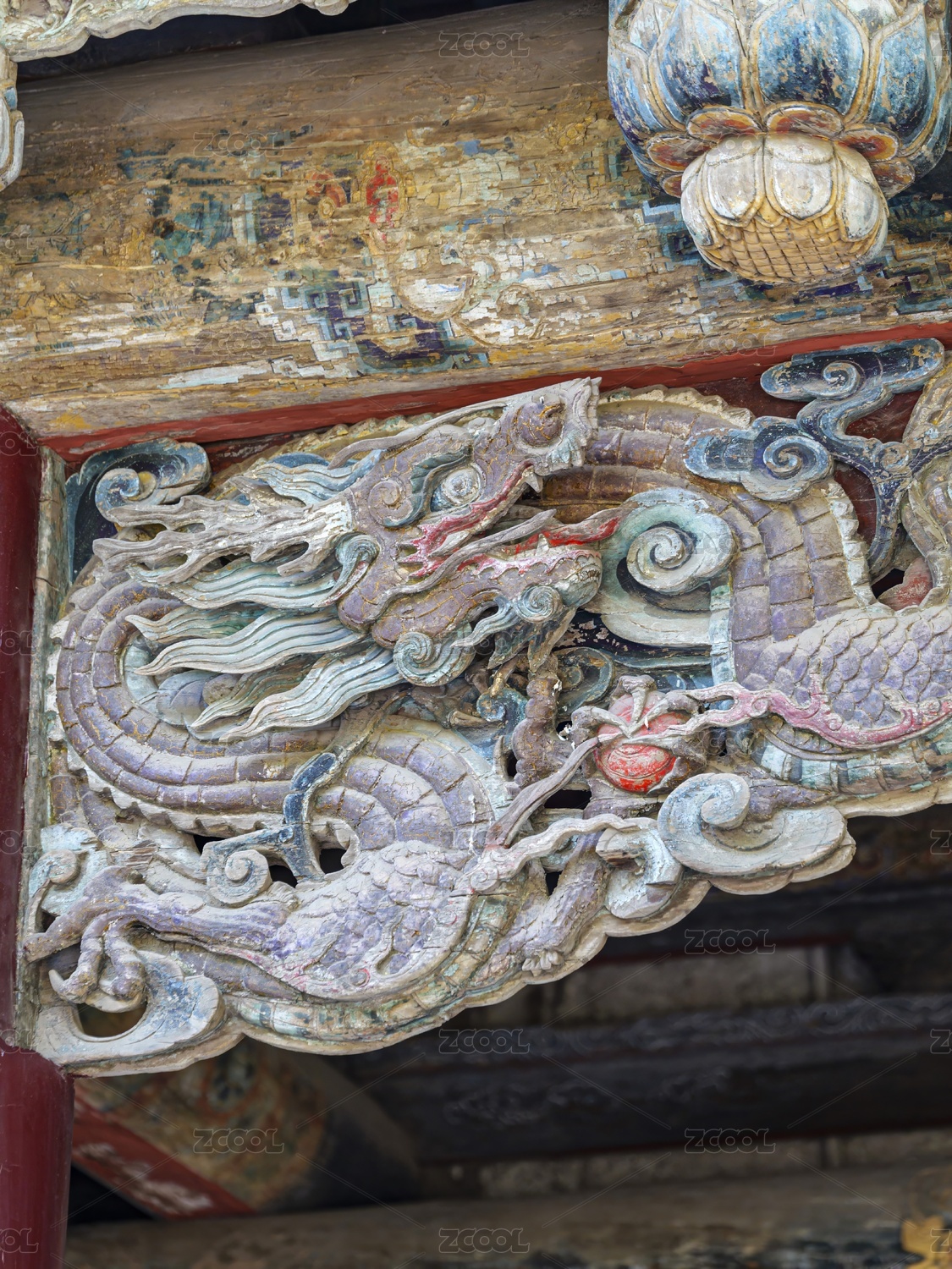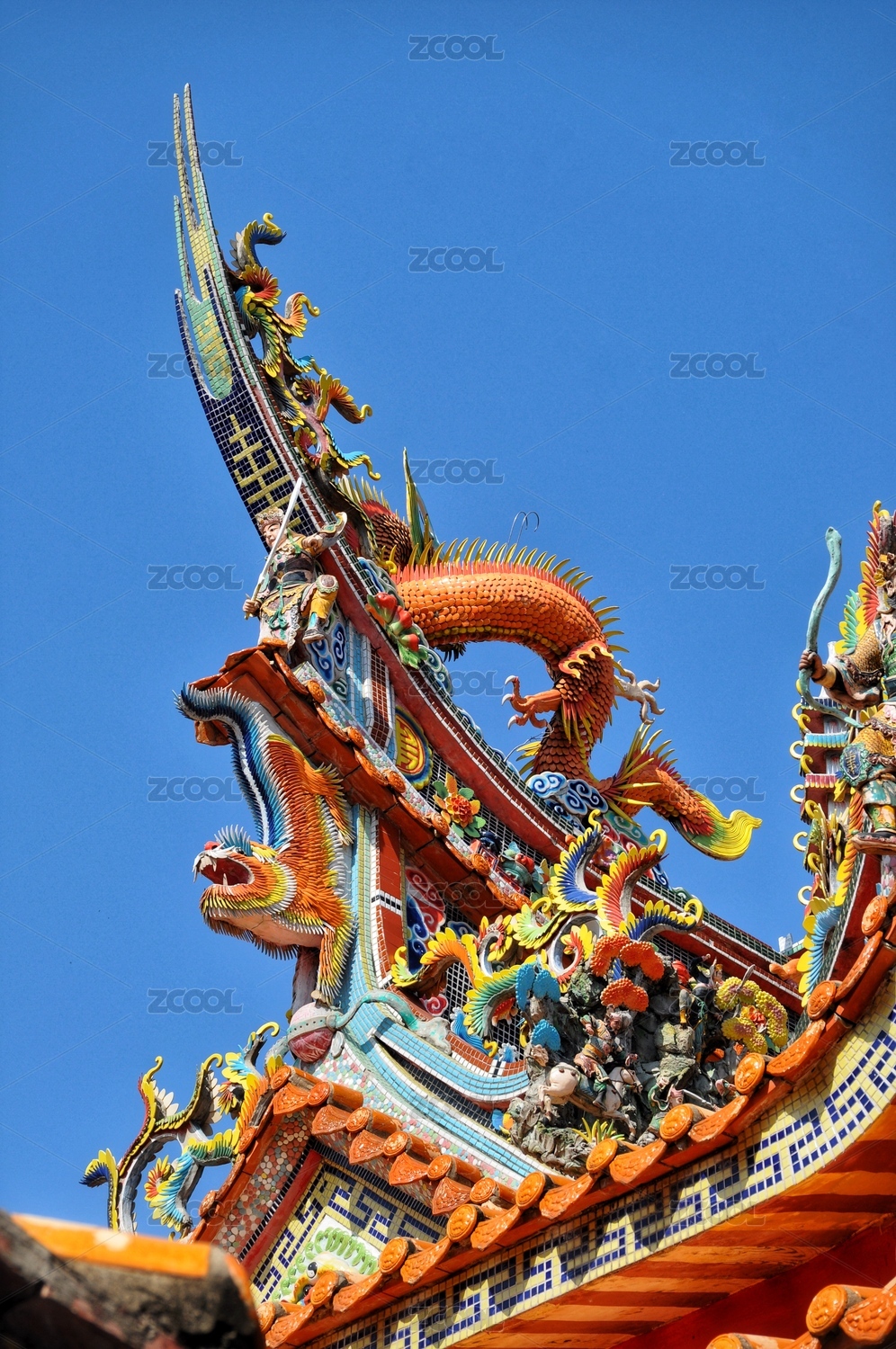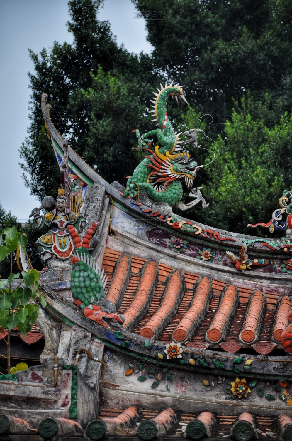 中国传统绿色琉璃瓦屋顶双龙戏珠