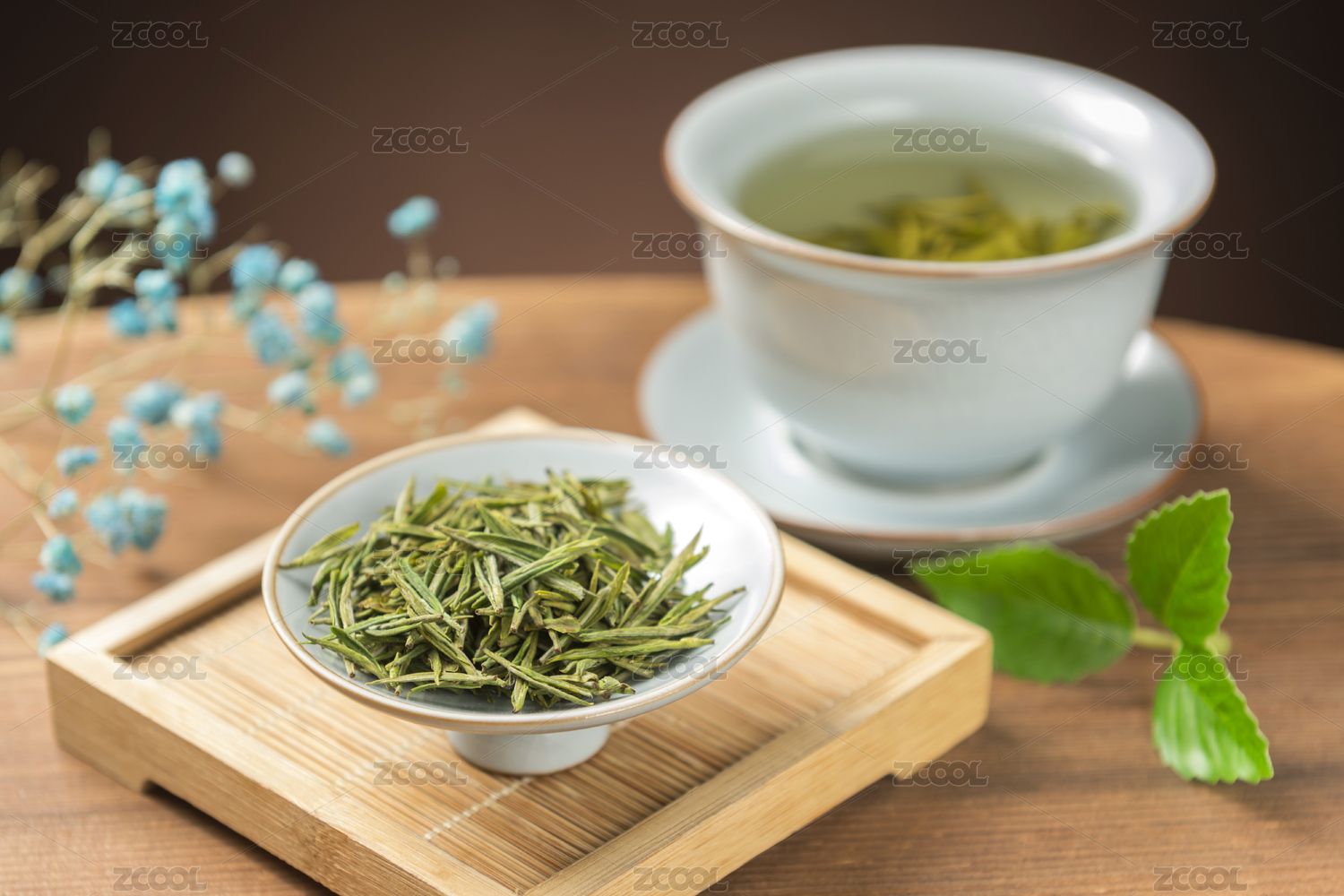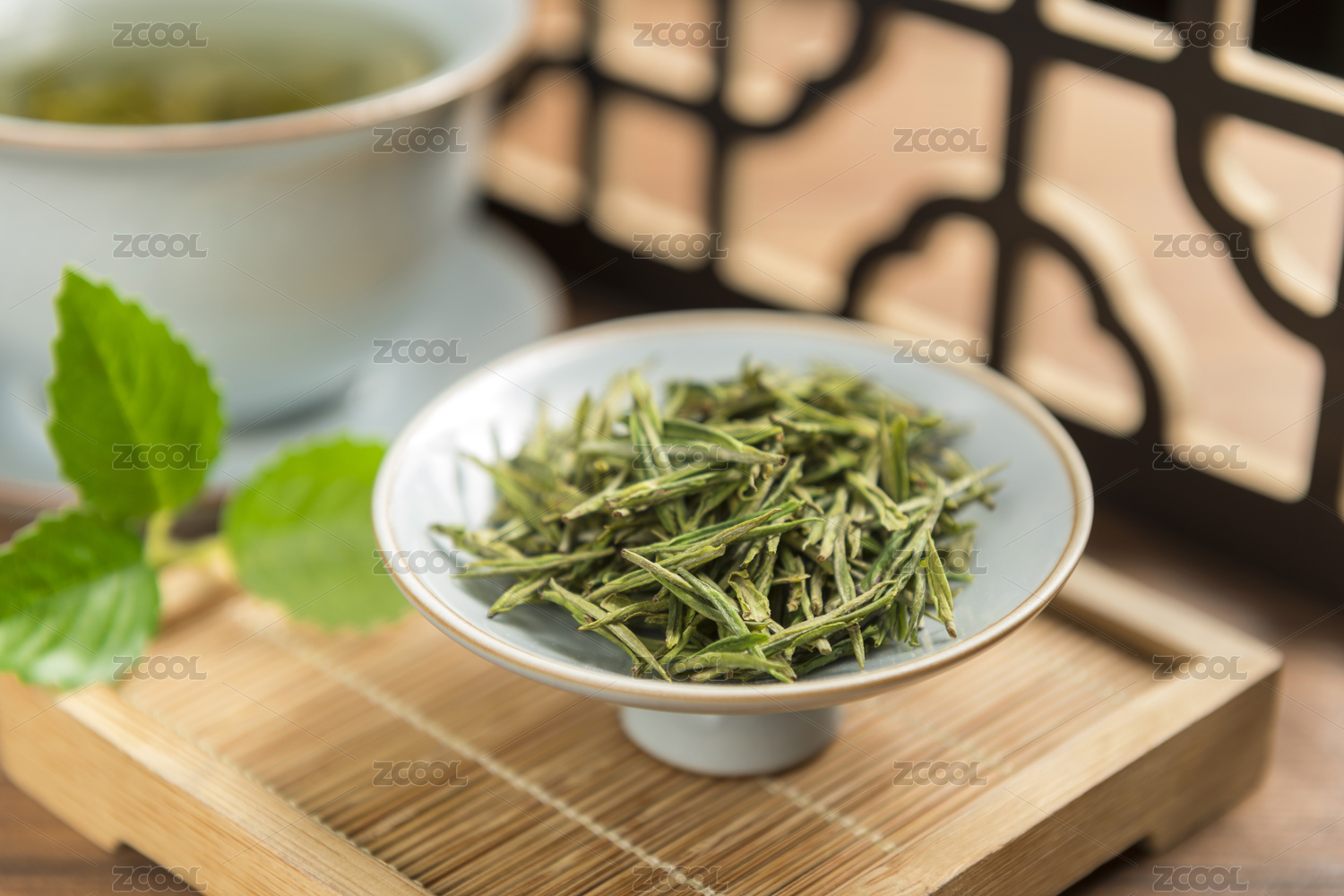 绿叶茶叶静置在木质托盘上