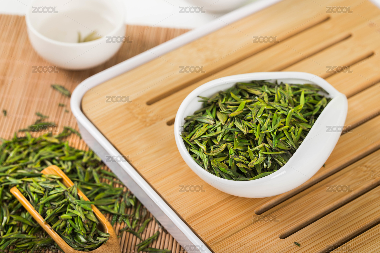 木底上放着一碗绿茶叶