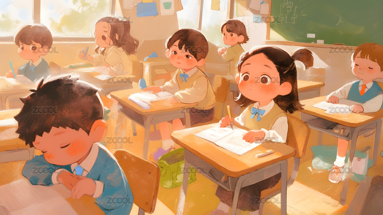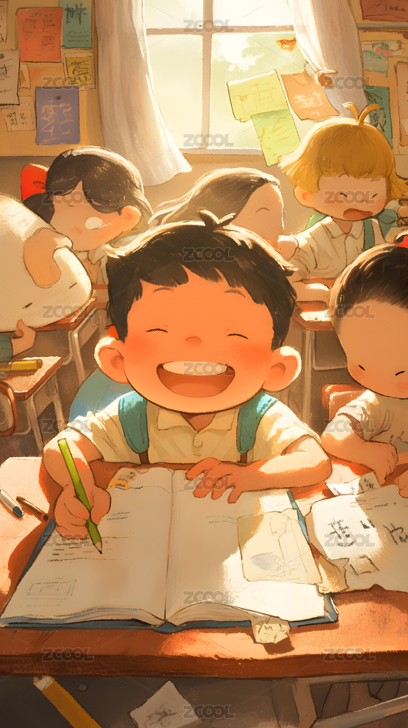 AIGC202402,卡通,学生,同学,教室,学习,插画