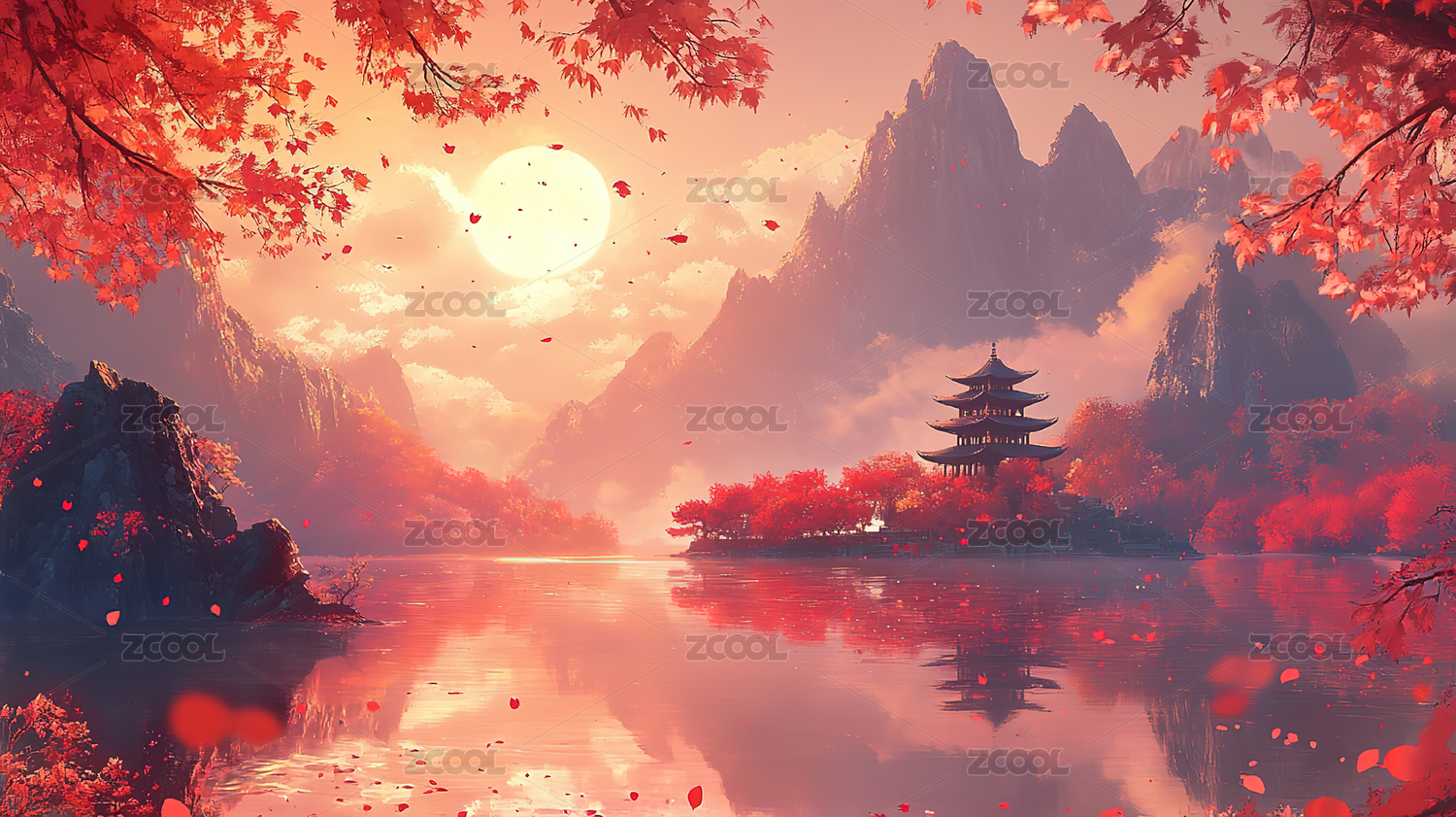 中国风建筑山脉云雾插画场景海报壁纸背景