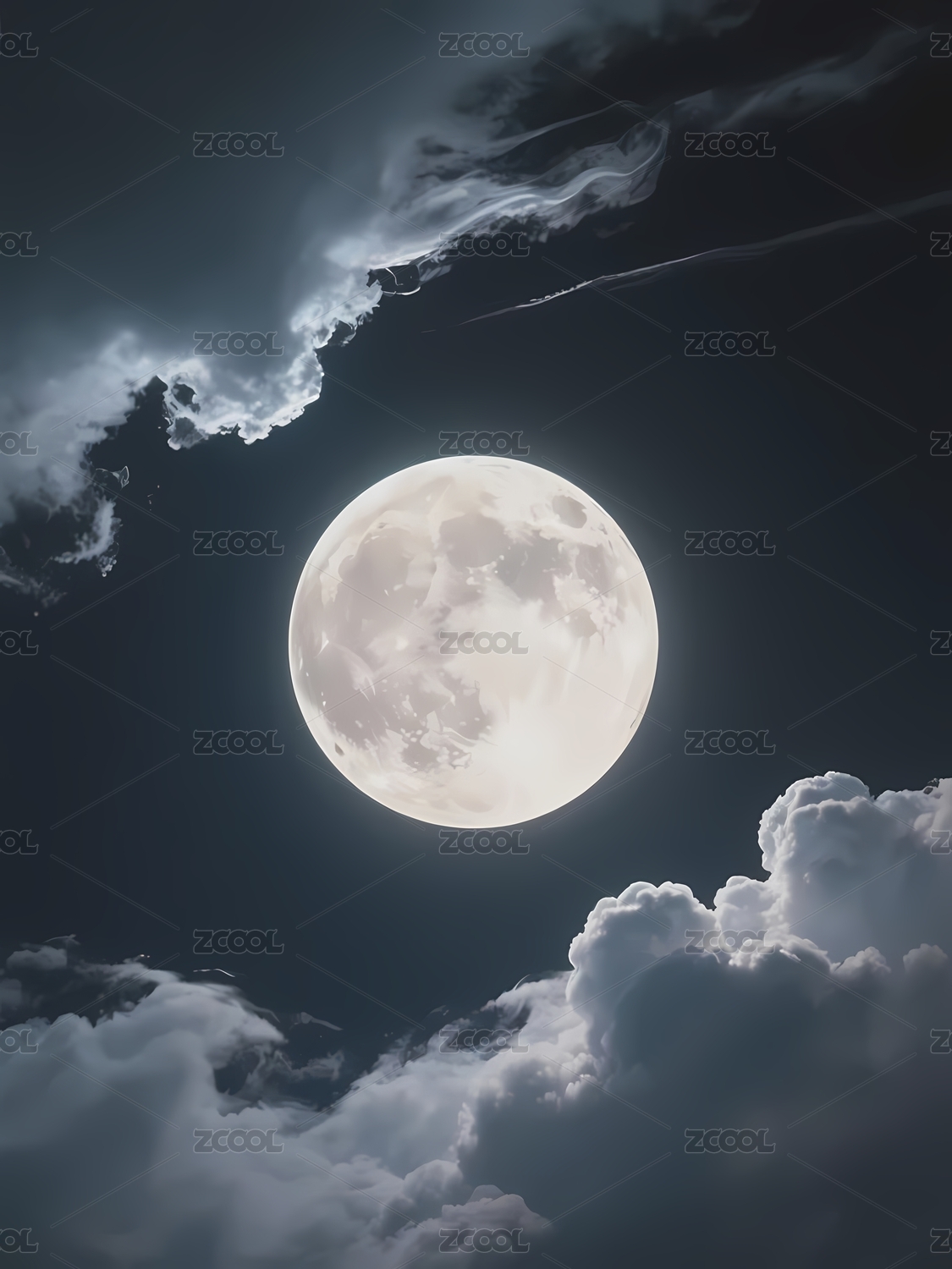 满月高悬于夜空云层之间