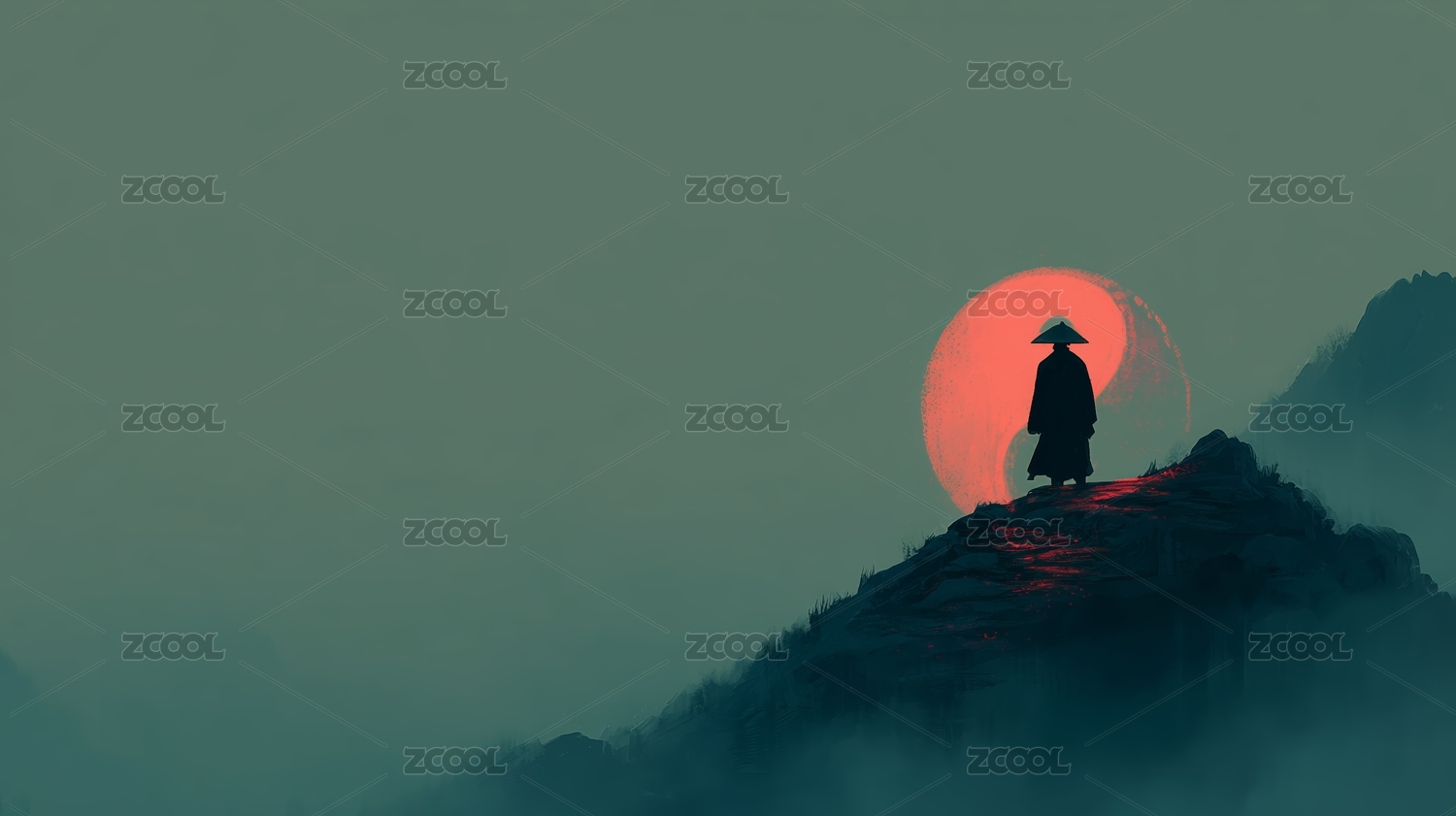 中国风水墨江湖武侠山顶人物插画