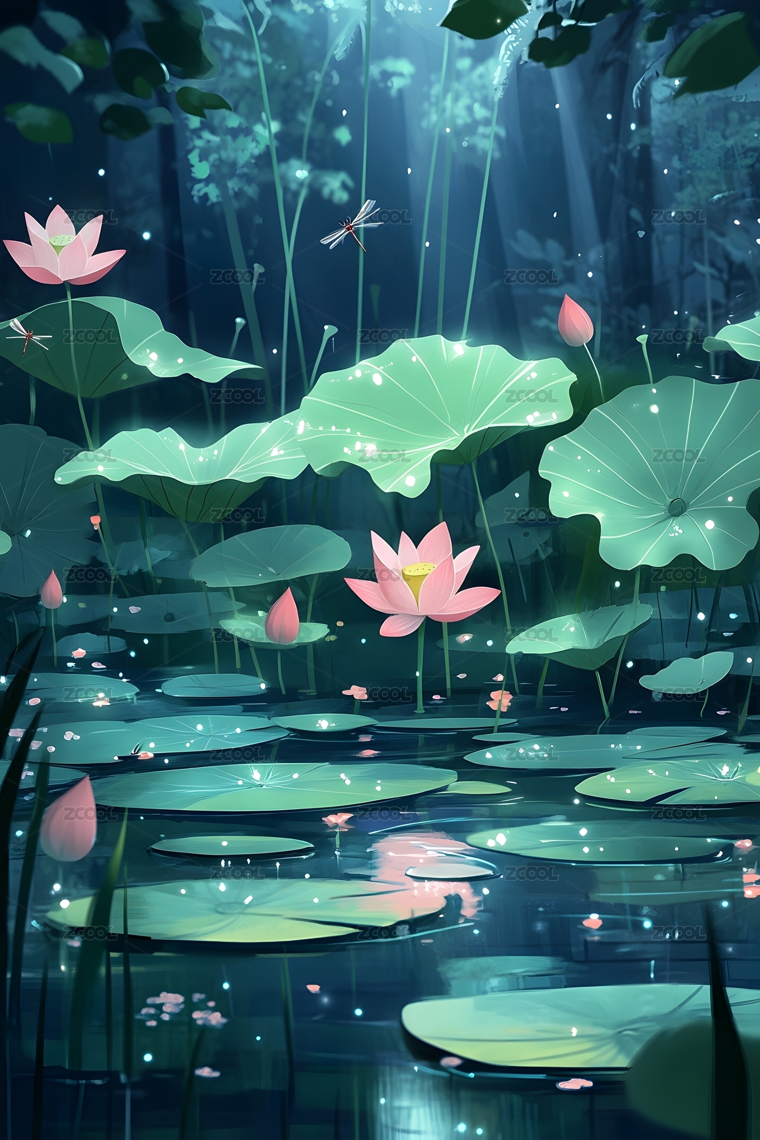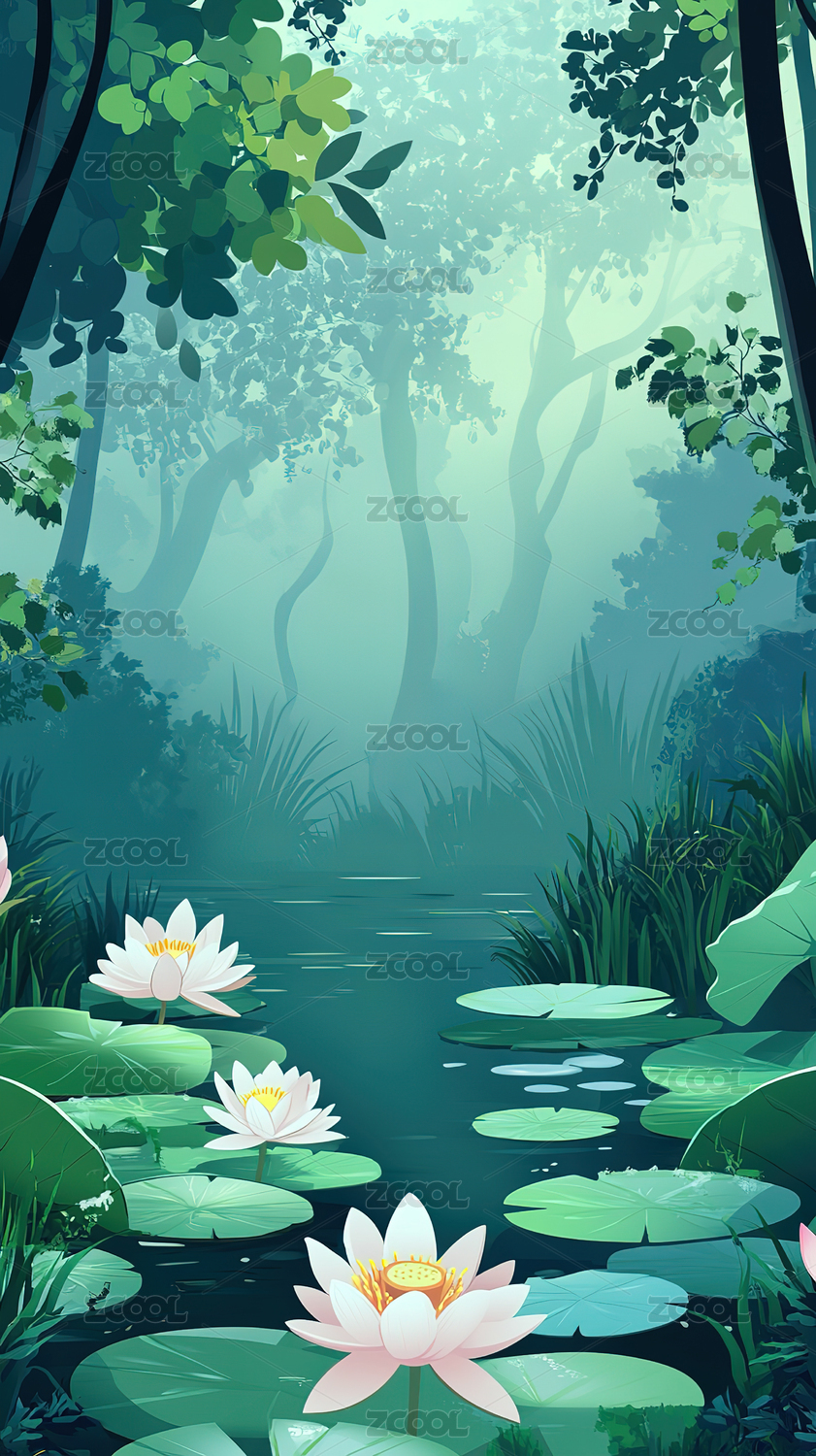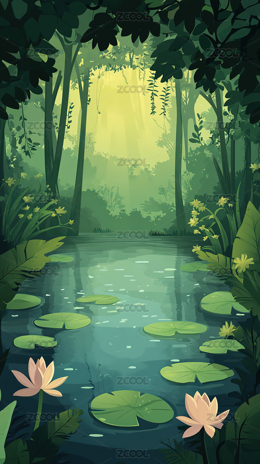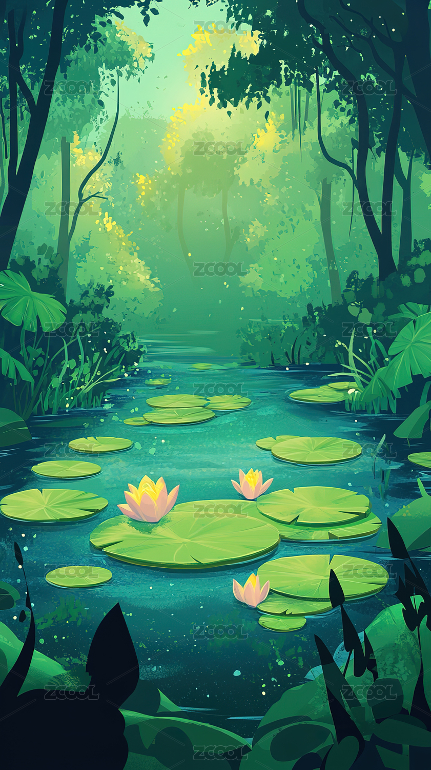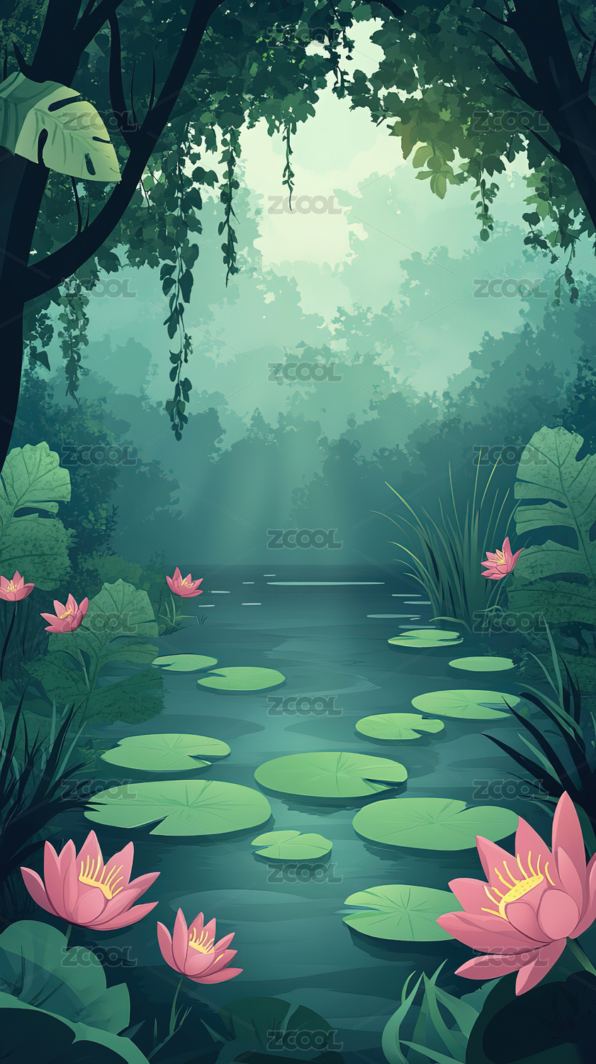 植物,自然,AI数字艺术,夏天,插画,花,自然美,池塘,叶子,户外