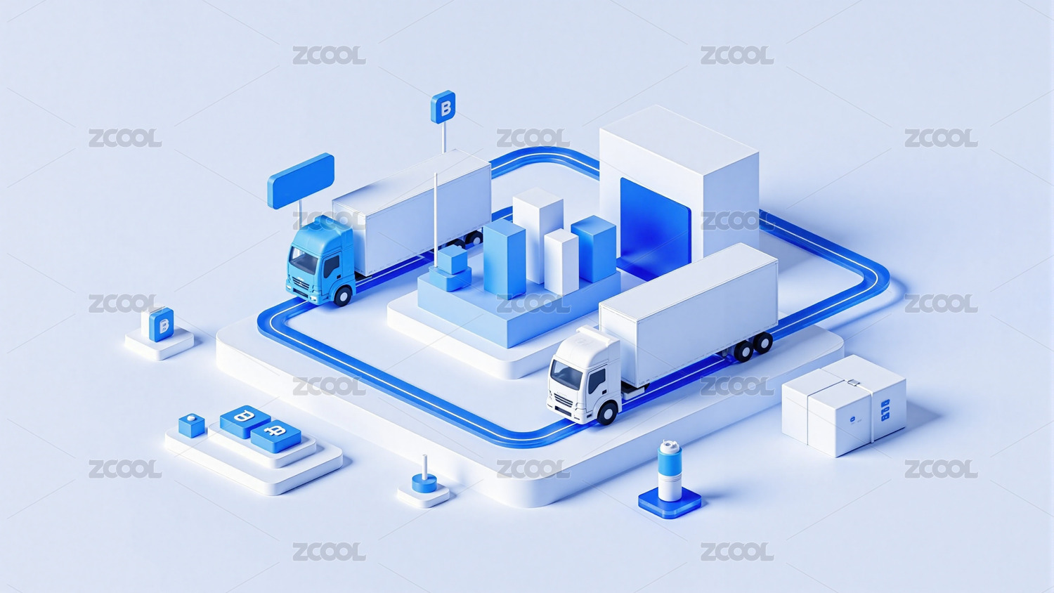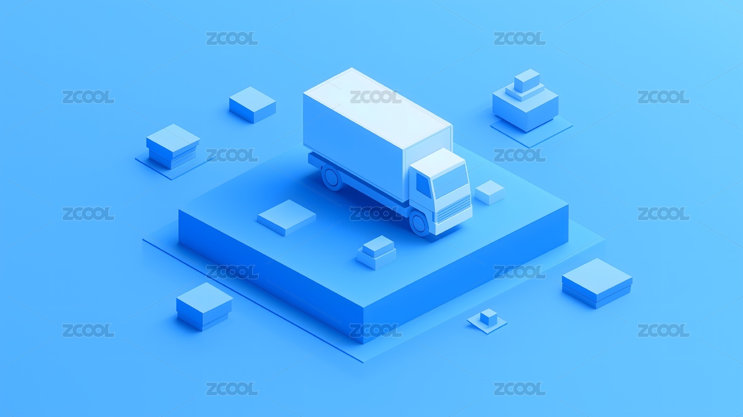 蓝色低多边形风格的卡车运输场景