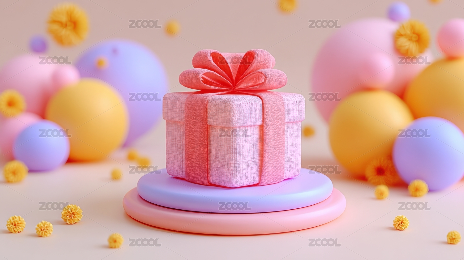 粉色礼盒与彩色气球的梦幻场景